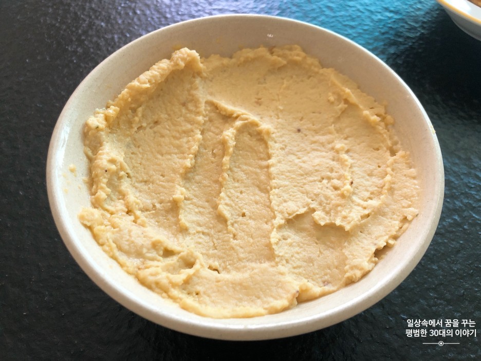 후무스 - 병아리콩, 깨소금, 올리브오일, 다진 마늘, 마요네즈, 라임즙, 소금