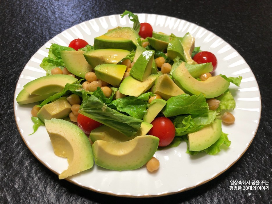 아보카도 샐러드 - 아보카도, 방울토마토, 병아리콩, 로메인, 소금, 올리브오일