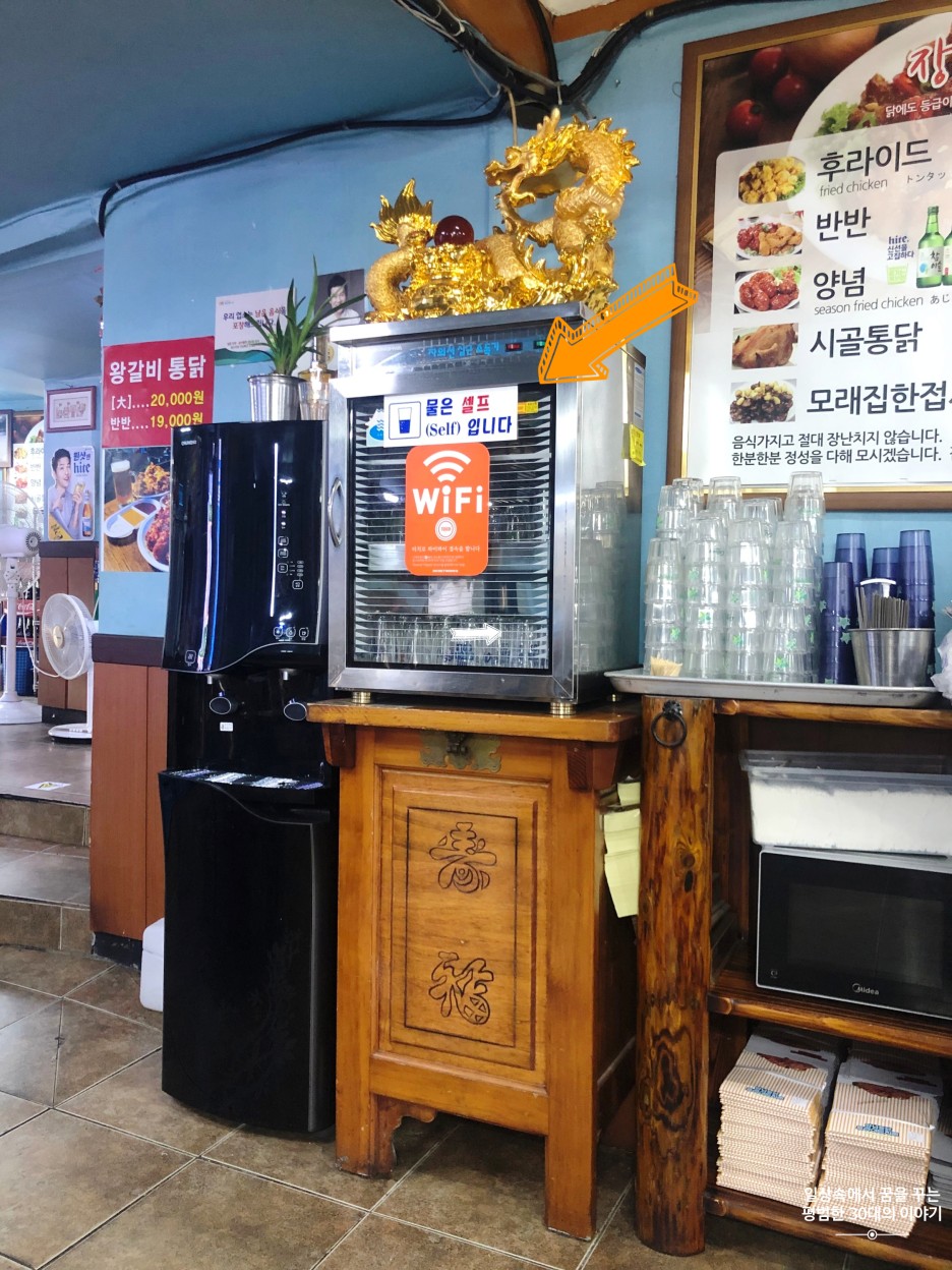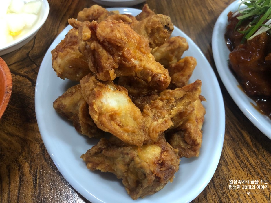 한 20분 정도 기다렸을까 (느낌적인 느낌으로는 영겁의 시간이 흐른 것 같았다는) 보기에도 바삭해 보이는 후라이드 치킨 반과 소스로 범벅된 왕갈비 맛 치킨 반이 나왔다. 어떤 치킨이든 후라이드부터 먹는 우리는 바로 후라이드 치킨을 하나씩 집어 들고 조심스레 한 입 베어 물었다. 입구에 하림 닭고기만 쓴다고 큼지막하게 쓰여있던데 괜한 말이 아니었구나 싶을 정도로 닭고기가 누린내 하나 안 나면서 촉촉하니 육즙이 입안에 확 퍼졌다. 그리고 치킨 사이즈도 큼지막하니 좋았다. 후라이드 치킨은 우선 우리 둘 모두에게 합격! 겉에 튀김이 조금 두꺼운 감이 없지 않아 있었지만 무척 바삭해서 거슬릴 정도는 아니었다. 역시 치킨은 뭐니 뭐니 해도 그 자리에서 튀기자마자 먹었을 때가 최고 맛있는 것 같다. 항상 치킨은 배달로 시켜 먹기 때문에 배달되는 동안 그 바삭함이 늘 반감되곤 하는데 여기서는 바삭함을 오롯이 느낄 수 있기 때문에 그것만으로도 이미 만족스럽다. 그러고는 이 동네에서만 맛볼 수 있다는 왕갈비 맛 치킨을 맛보았다. 윙? 양념치킨에 바비큐 소스 섞은 맛(?) 왜 유명한 건지 알 수 없는 이도 저도 아닌 그런 소스 맛... 처음 한두 조각은 처음 맛보는 맛이라 그럭저럭 먹을만했는데 그 뒤로는 질리는 맛이라 해야 할까. 쉽게 질리는 그런 맛이었다. (나와 짝꿍의 개인적인 의견) 우리 둘은 아무 말 없이 서로를 마주 보며 고개를 끄덕였다. 그러고는 후라이드 치킨을 집중 공략했다. 우리 둘 다 꽤 잘 먹는 대식가임에도 불구하고 다 먹기는 힘들 정도로 양이 많았는데 보통 치킨을 배달 시켜 먹을 때의 양보다 1.5배~2배는 되는 것 같았다.