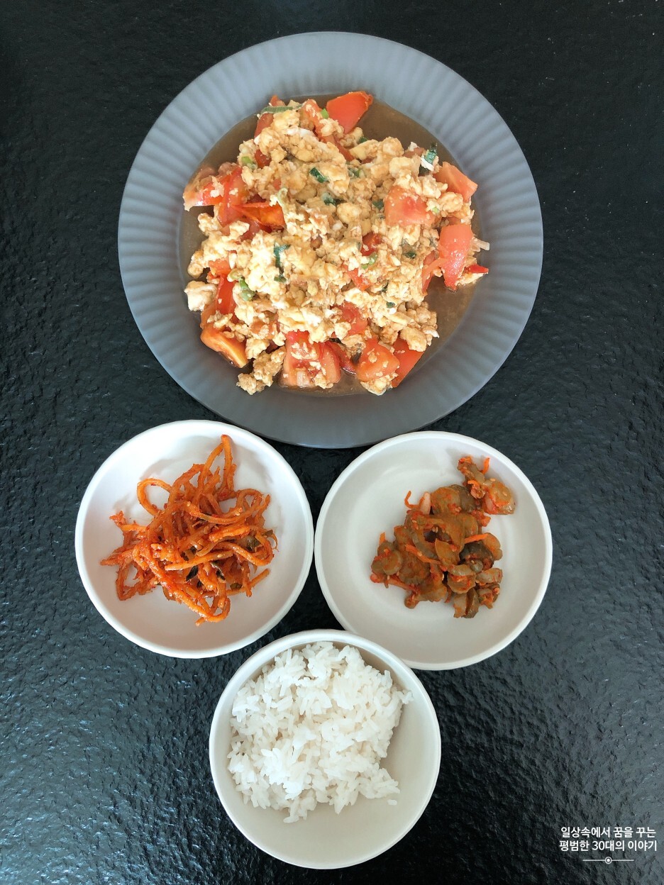 메뉴: 토마토 계란 볶음, 진미채볶음, 오이지
