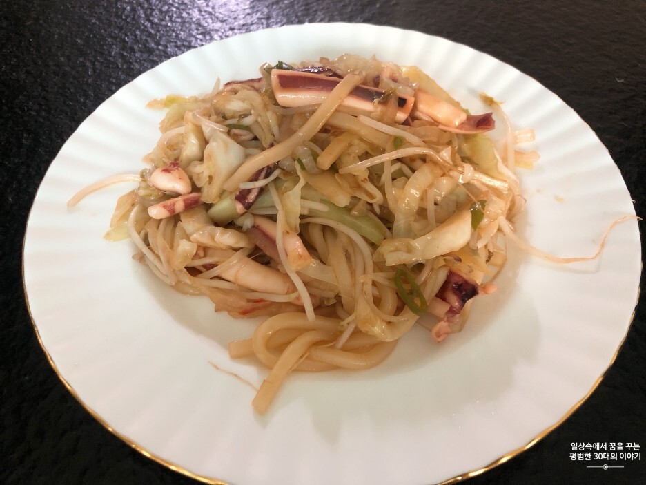 볶음우동 - 우동면, 오징어, 양배추, 양파, 숙주나물, 청양고추, 고추기름, 굴 소스, 간장, 설탕