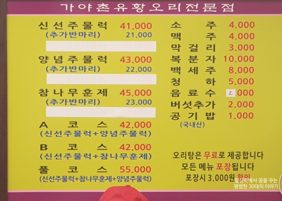 올봄에 엄마를 모시고 다녀온 가야촌 유황오리 대방점. 가야촌 유황오리는 지점이 무척이나 많아서 동네에 하나씩은 거의 있는 것 같다. (느낌적인 느낌) 우리 동네에도 지점이 하나 있는데 엄마 말로는 이 지점이 이곳에 생긴지 꽤 오래되었다고 한다. 엄마가 아주머니 모임을 종종 이곳에서 했는데 맛이 괜찮아 우리를 데리고 꼭 한 번 같이 오고 싶었단다. 나보다는 짝꿍 때문이듯; 역시 사위 사랑은 장모님인 건가.