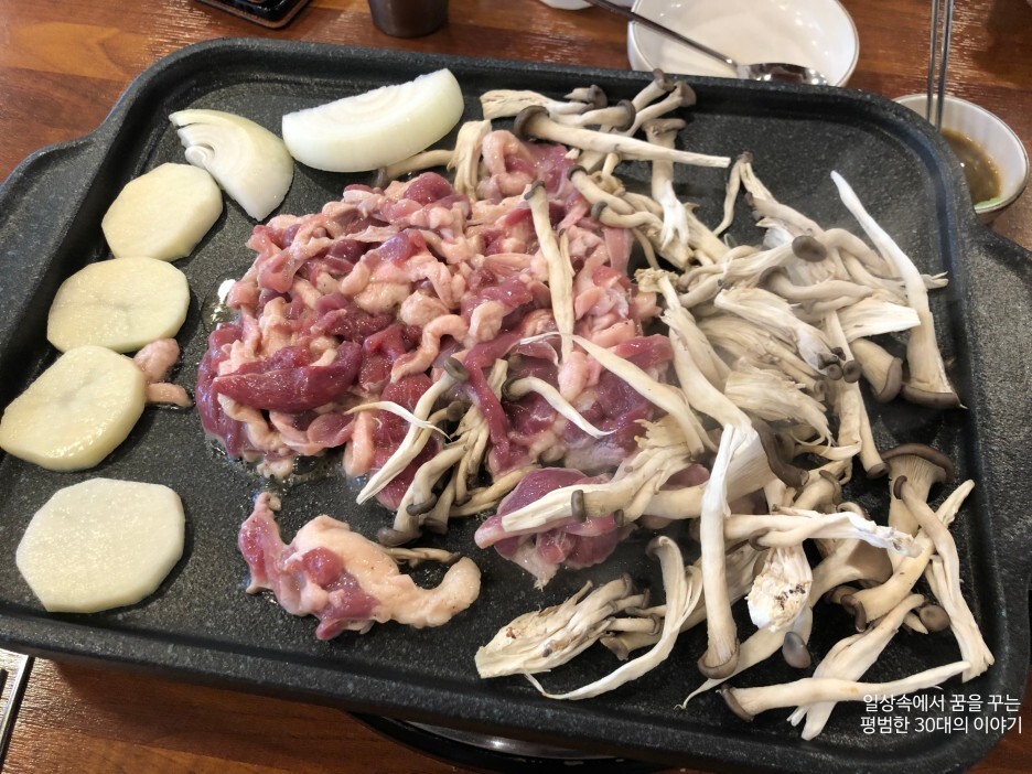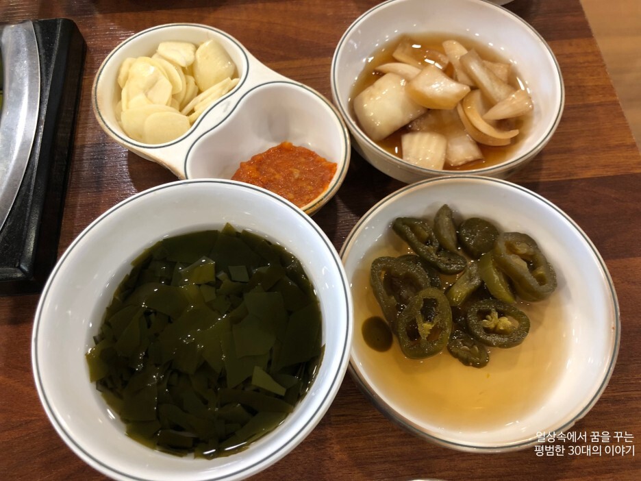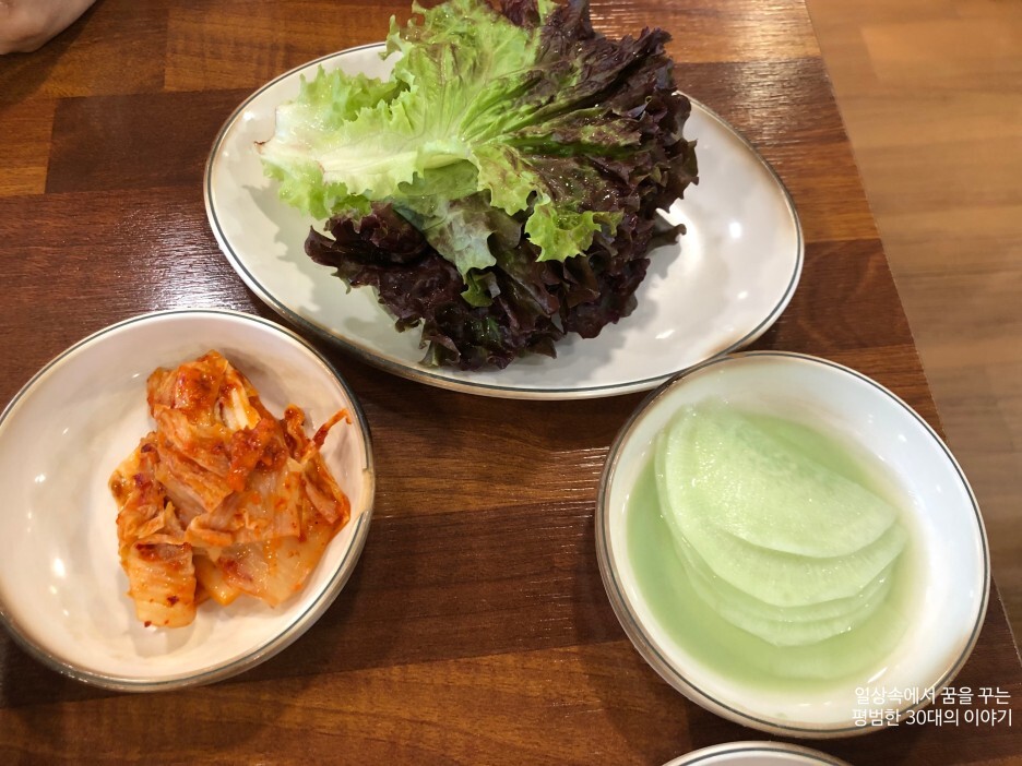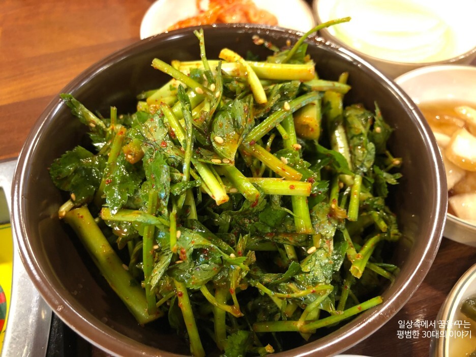 우리는 셋이서 A코스 신선 주물럭+양념 주물럭(42000원)을 주문하였는데 셋이 먹기 딱 적당한듯! 기본 반찬으로 미역냉국, 양파절임, 고추절임, 무 쌈, 상추, 김치, 마늘, 미나리 무침 그리고 쌈장이 나온다. 이 집 단골손님인 엄마의 말에 의하면 미나리 무침이 그렇게 맛있단다. 그래서 엄마는 친구와 함께 오면 미나리 무침만 몇 그릇씩 먹기도 한단다. 먹고 나서 왜 그런지 알겠더라는... 짝꿍 입맛에는 향이 너무 강해서 화장품 맛 난다고;; 나머지 반찬은 사서 쓰는 건지 어쩐 건지 그다지 특별할 게 없었다.
