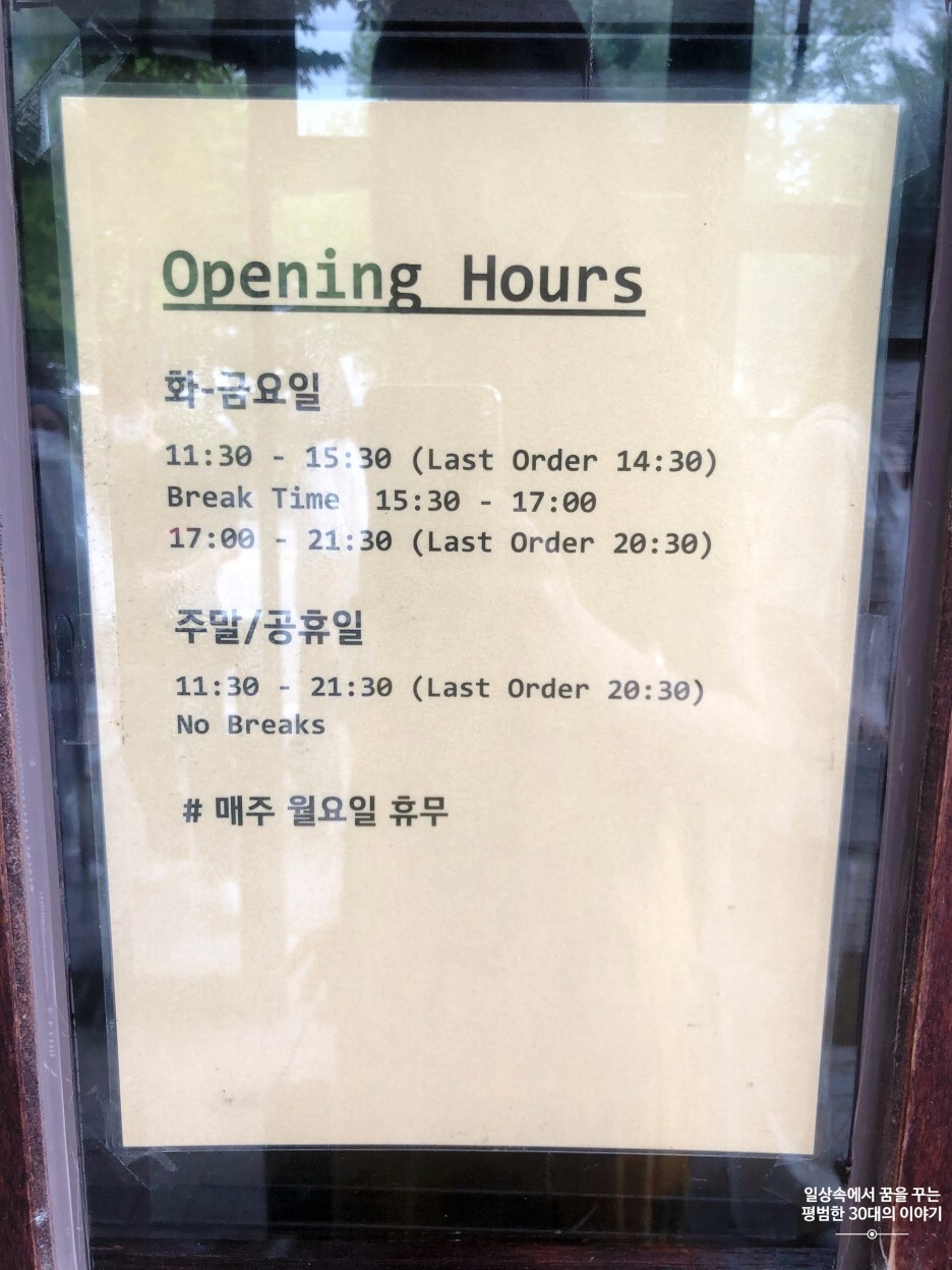 영업시간: 화요일~일요일 11:30~21:30(평일 브레이크 타임 15:30~17:00, 주말 브레이크 타임 없음)