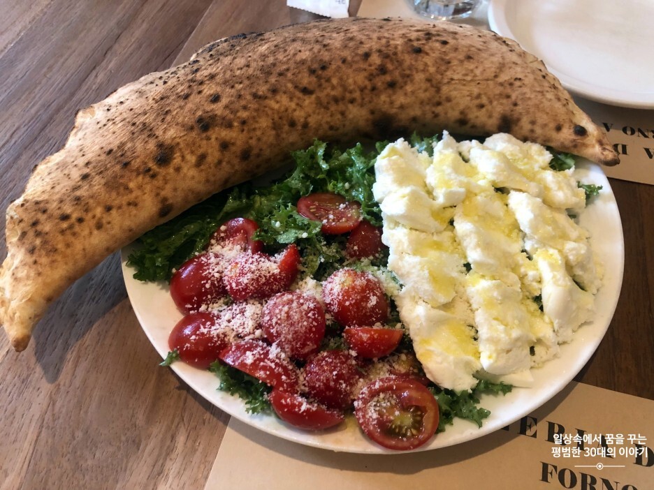 친구가 카프레제 샐러드(13200원)과 스파게티 알 페스토 디 루꼴라(16500원)을 주문했다. 음식은 생각보다 금방 나왔는데 아무래도 샐러드랑 스파게티를 주문해서 그런 것 같다. 카프레제 샐러드는 화덕에 구워낸 빵과 방울토마토, 모차렐라치즈 그리고 치커리가 같이 나오고 스파게티 알 페스토 디 루콜라는 스파게티 면, 루콜라 페스토, 방울토마토, 파르미지아노 치즈 그리고 루콜라가 같이 나온다. 딱 보자마자 둘이서 먹기에는 좀 부족하지 않을까 싶었는데 먹고 나서는 그런 생각이 쏙 들어갔다. (물론 이건 내 친구가 소식가여서 가능한 얘기, 대식가 둘이 오면 세 개는 주문해야 할 듯)