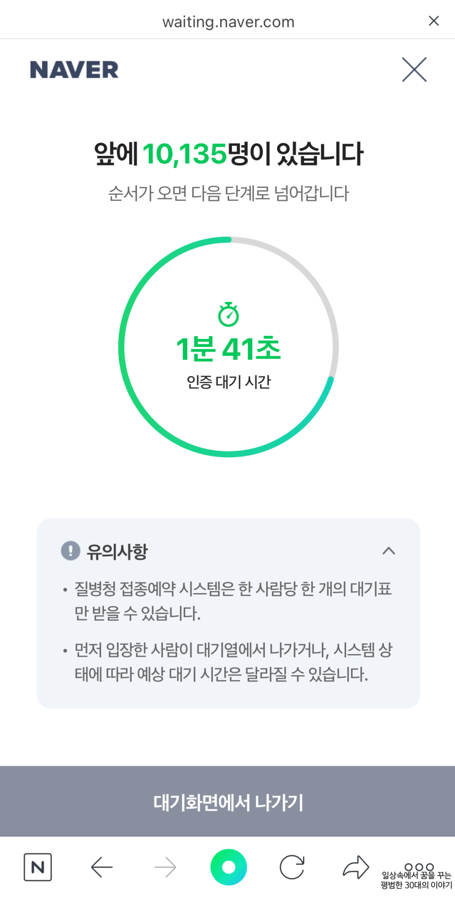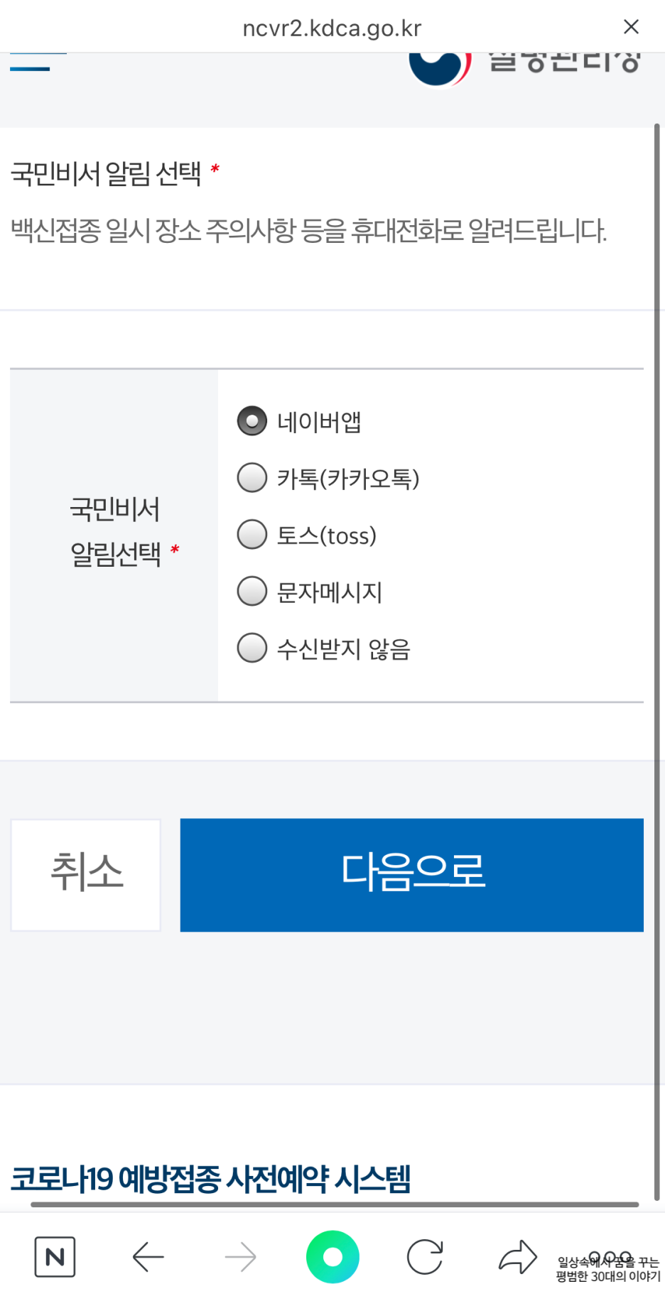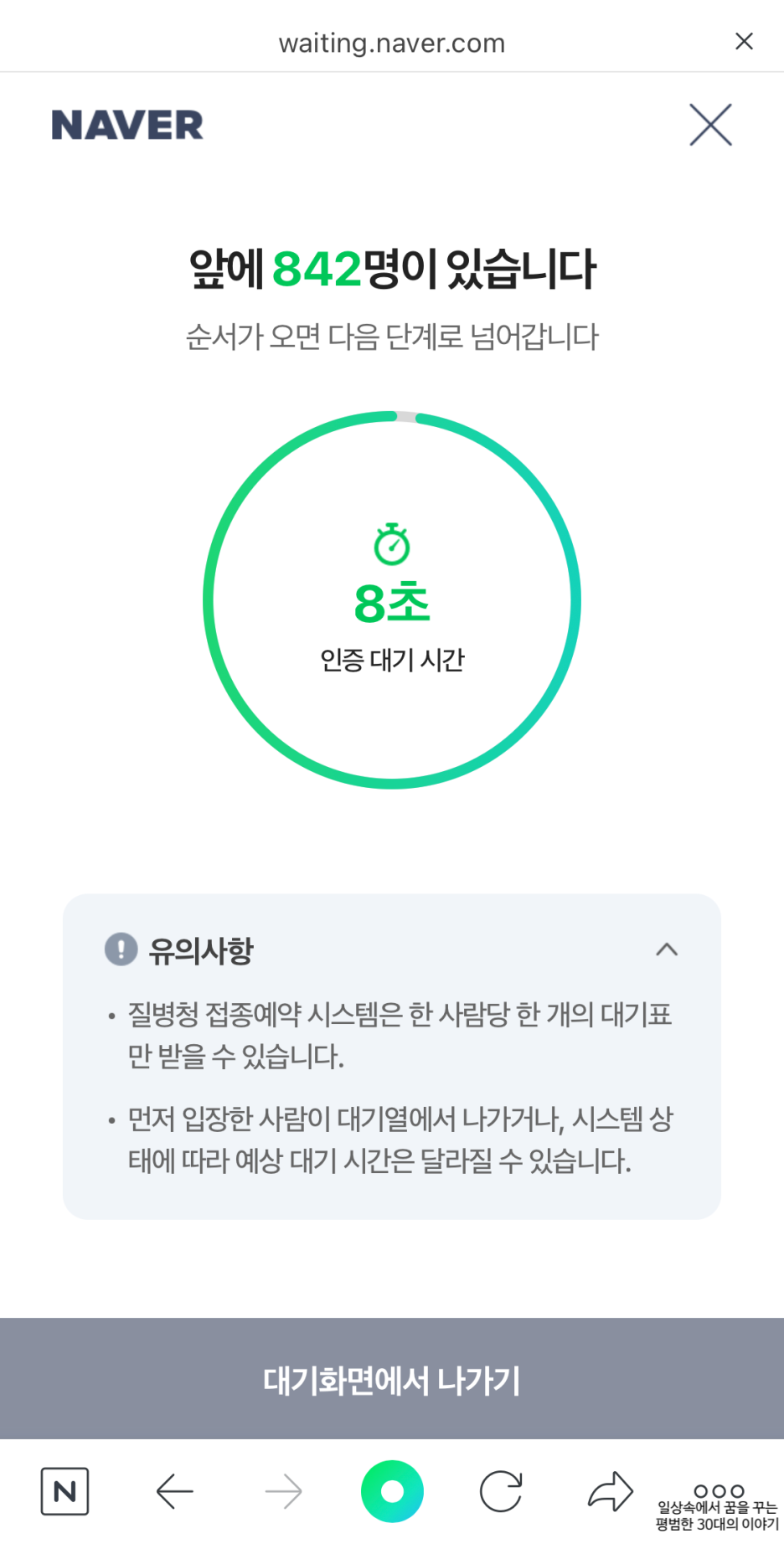 노트북으로 할까 핸드폰으로 할까 고민하다가 핸드폰으로 접종 예약을 진행했다. 네이버 인증서로 접종 예약을 할 계획이었기 때문에 초록색 창에 코로나 백신 예약을 검색한 뒤 저녁 8시 되기 5분 전부터 두근거리는 마음을 진정시켜가며 핸드폰 화면을 뚫어져라 쳐다보았다. 저녁 8시가 되자마자 바로 접종 예약 웹사이트에 접속했다.