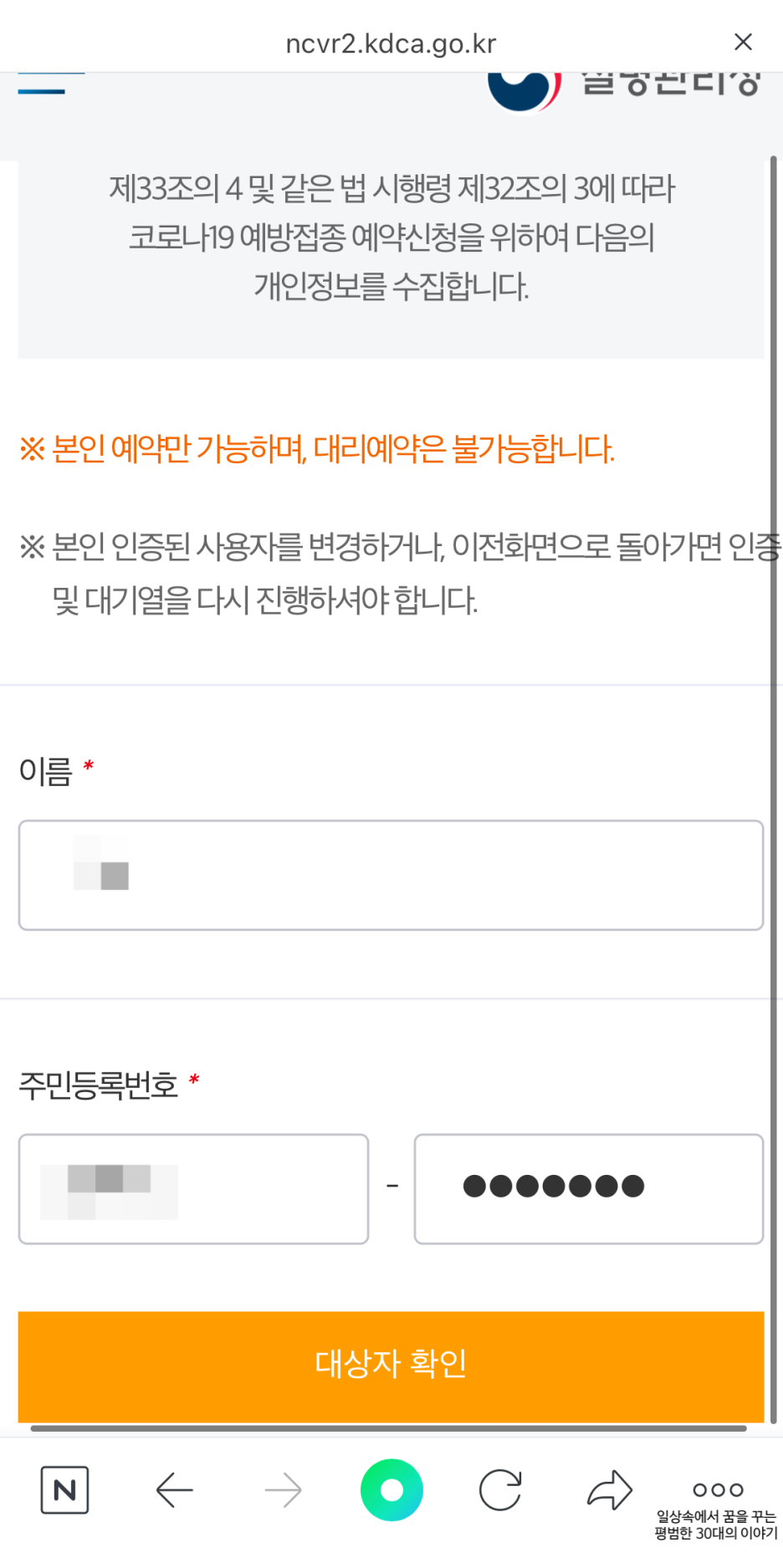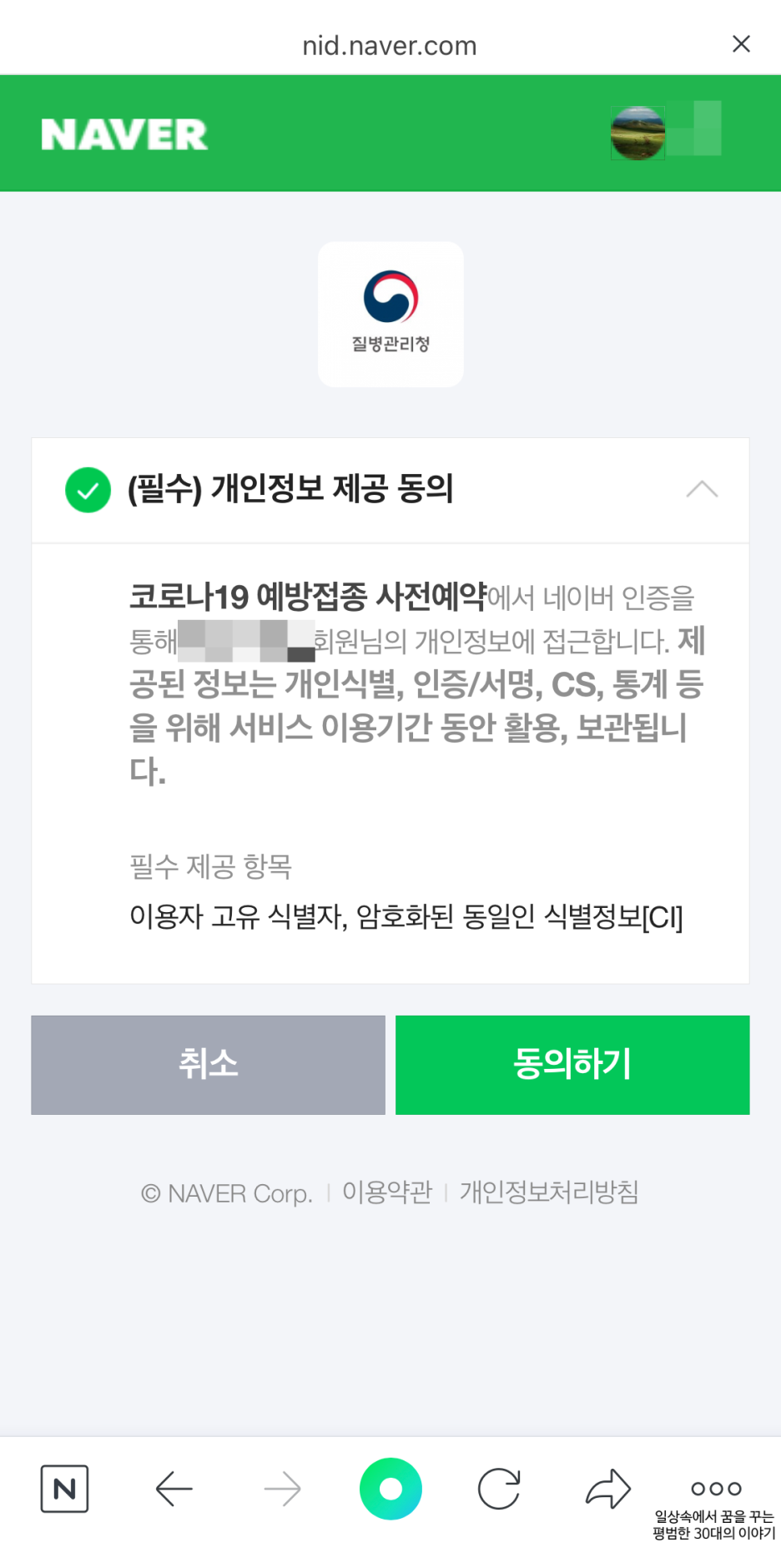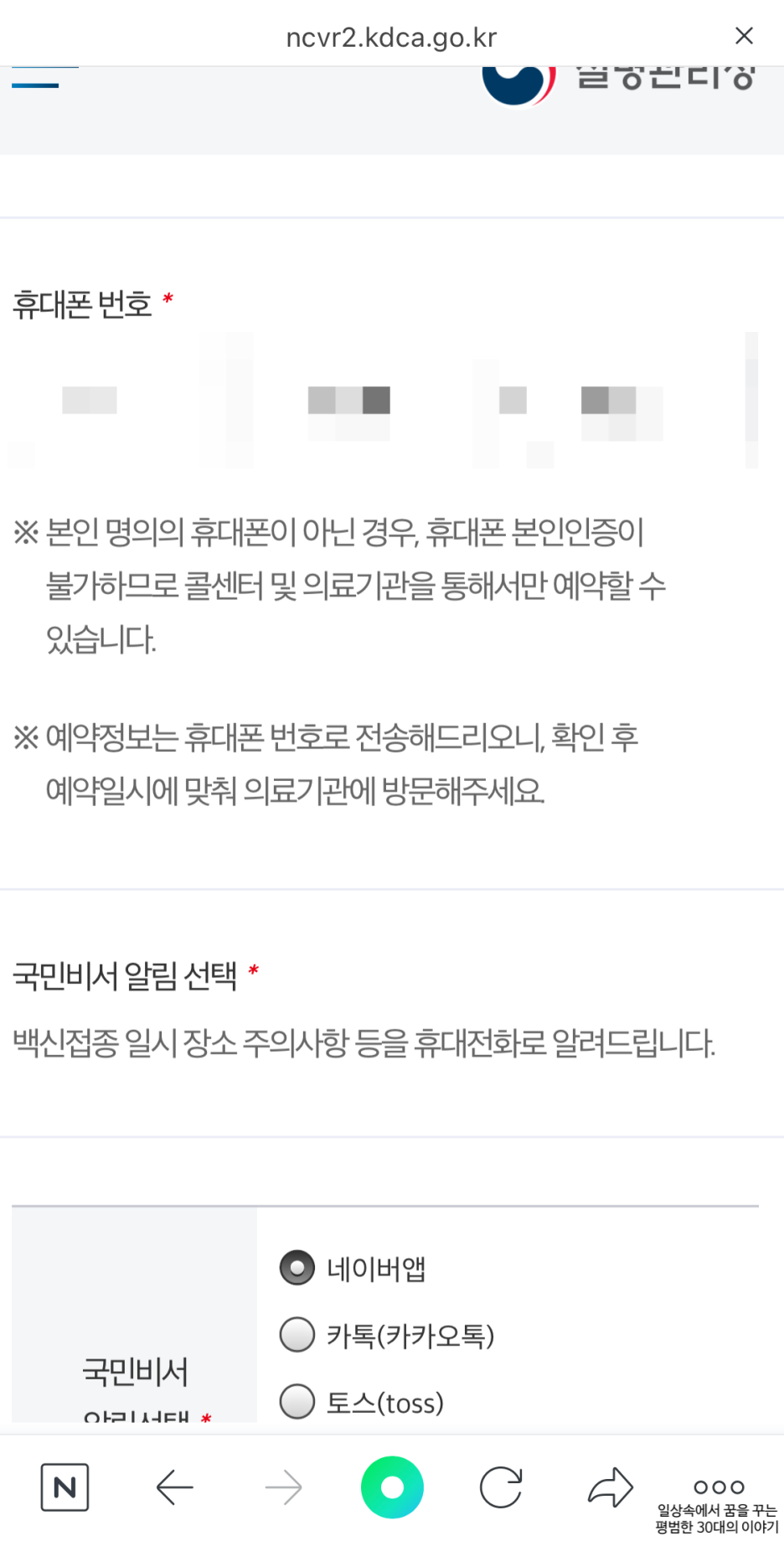 노트북으로 할까 핸드폰으로 할까 고민하다가 핸드폰으로 접종 예약을 진행했다. 네이버 인증서로 접종 예약을 할 계획이었기 때문에 초록색 창에 코로나 백신 예약을 검색한 뒤 저녁 8시 되기 5분 전부터 두근거리는 마음을 진정시켜가며 핸드폰 화면을 뚫어져라 쳐다보았다. 저녁 8시가 되자마자 바로 접종 예약 웹사이트에 접속했다.