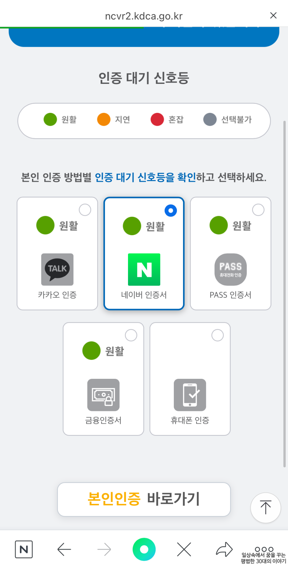 접속하면 각 인증서별 현황이 나오는데 저녁 8시 딱 되자마자 여서 그런지 모두 원활하다고 나와있긴 하더라. 뭐 20분 만에 접종 예약을 완료했으니 원활하다고 할 수 있긴 하다. 나는 네이버 인증서로 예약을 할 거였기 때문에 네이버 인증서를 선택한 후 아래 사진에 나와있는 순서대로 쭉 진행하면 된다.