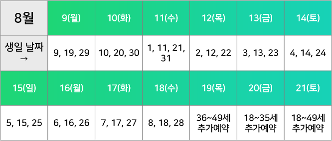 * 10부제 예약으로, 생일 날짜에 따라 예약 일이 달라요.
