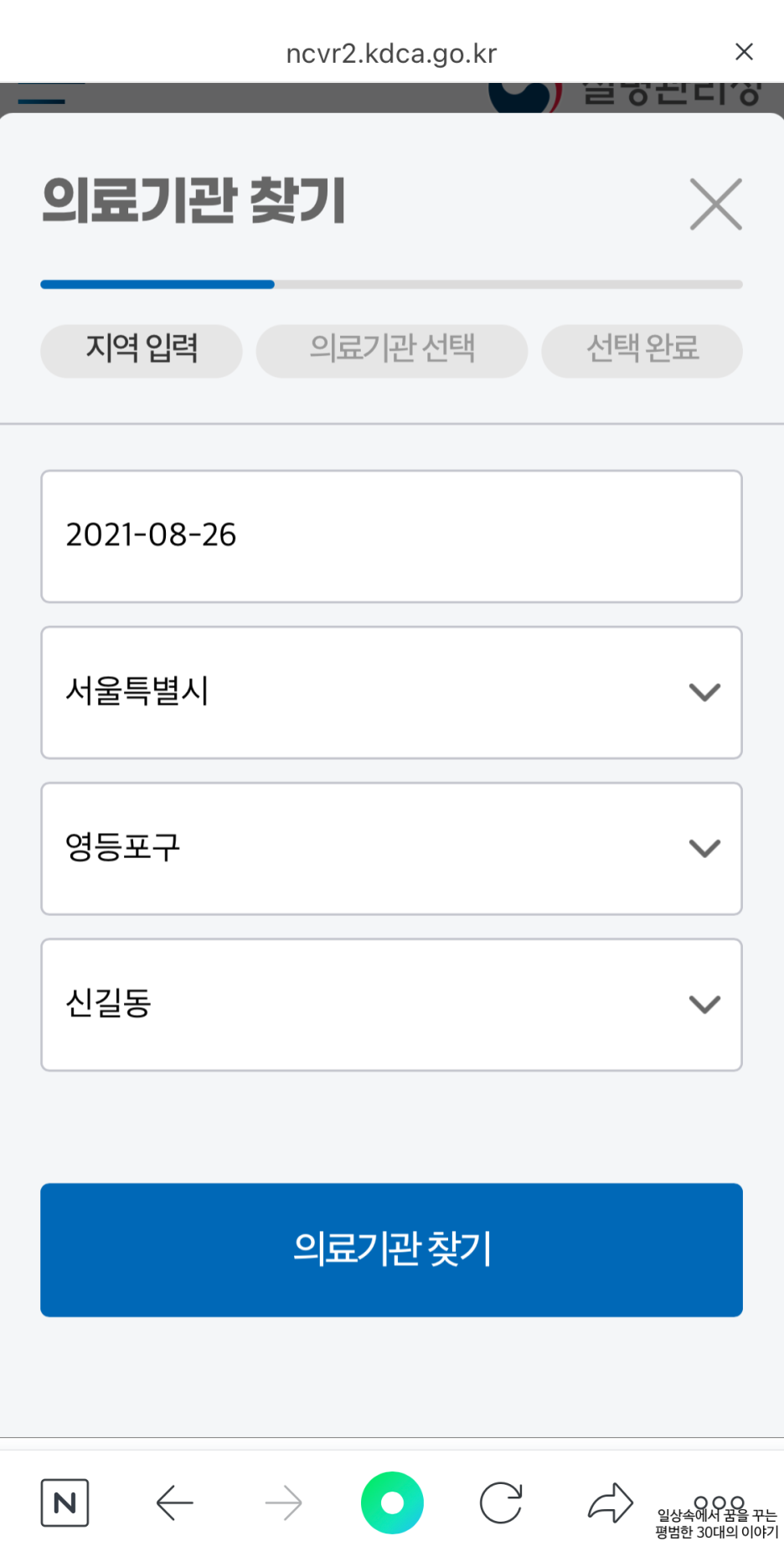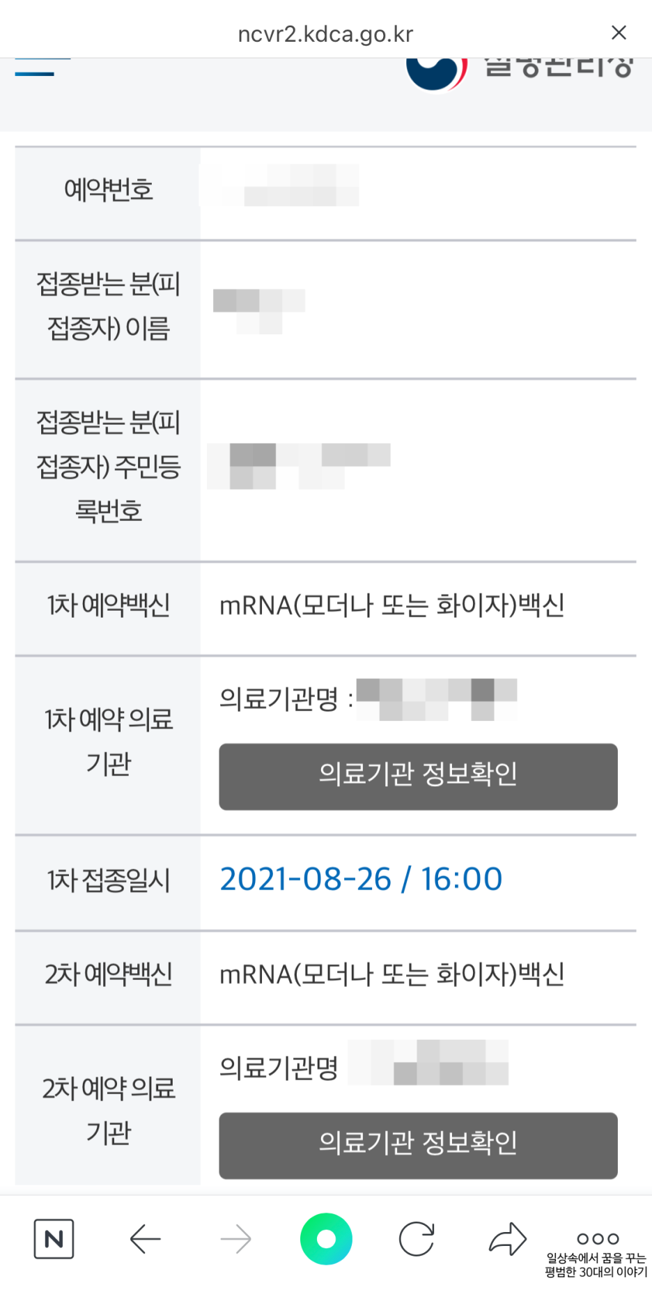 가장 고비였던 대기 상태를 지나고 나면 대상자 여부를 확인하기 위해 개인 정보를 입력해야 한다. 대기자임이 확인되면 의료기관 찾기의 난관이 기다리고 있다. 나는 8월 26일 첫날 접종을 하고 싶었으므로 날짜를 26일로 하고 가나다순으로 나와있는 의료기관 중에 가장 첫 번째 의료기관 순으로 접종 예약이 가능한 시간대가 있는지 확인해 나가기 시작했다. 그렇게 몇 번 해보니 계속 예약 불가여서 아예 맨 끝에 있는 ㅎ자로 시작하는 의료기관을 확인하기 시작했다. 그랬더니 바로 예약 가능!!! 의료기관에서 잘 선택하는 게 중요하다. 이 과정이 두 번째로 가장 많은 시간을 잡아먹기 때문이다. 이 과정만 지나고 나면 바로 예약 완료!