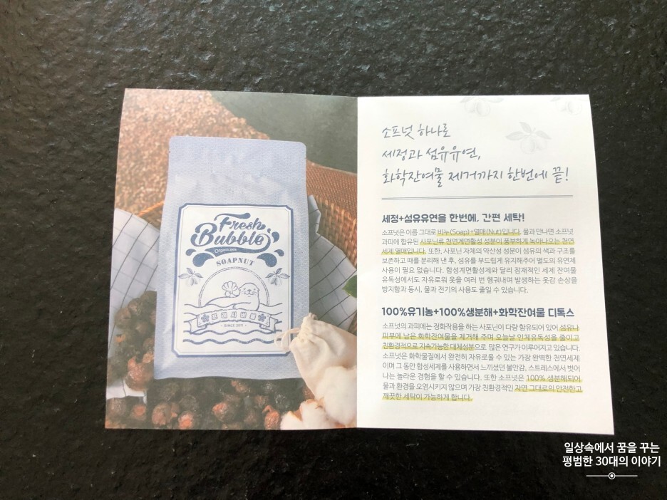 그동안 사용하기 망설여졌던 제품이 대나무 칫솔, 소프너트 열매, 설거지 비누 그리고 고체 치약이었는데 이번 기회에 사용해 볼 수 있게 돼서 너무 좋다. 사용하기 망설였던 이유야 많지만 각 제품 별로 핑계를 대보자면 다음과 같다. 대나무 칫솔은 잇몸이 약한 내가 사용하기에는 조금 아플 수도 있다는 생각이 들어서, 소프너트 열매는 사용하기 번거롭고 세정력이 떨어진다는 후기를 많이 봐서, 설거지 비누는 이미 사둔 대용량 주방 세제가 아직 많이 남아서, 마지막으로 고체 치약은 남편의 반대로.(남편은 고체 치약이 낯설고 불편하단다. 같이 사는 동거인이기 때문에 친환경 제품을 선택함에 있어 그의 의견도 나에게는 중요하다.) 어쨌든 이렇게 사용해볼 수 있는 기회가 생겼으니 그동안의 핑계는 잠시 접어두고 사용해보기로 한다.