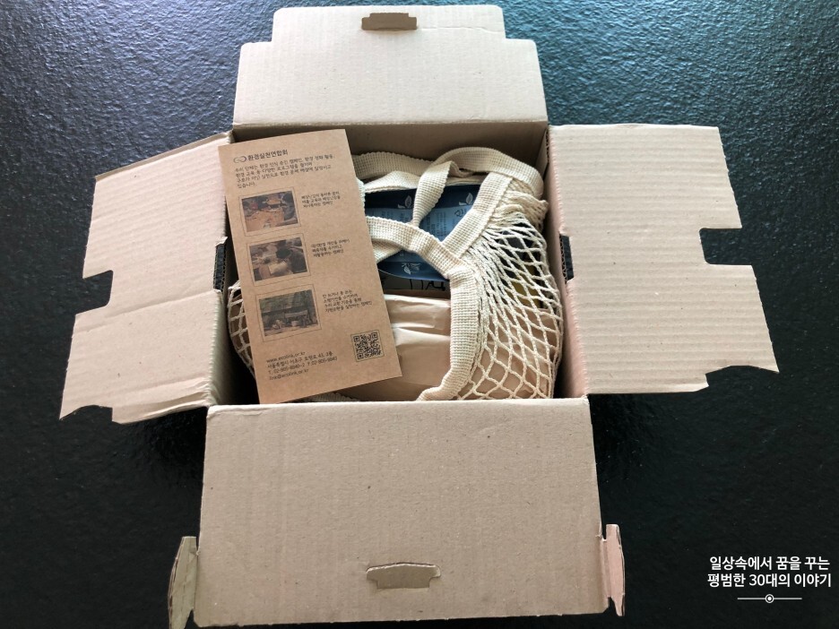 메시지를 받고 언제쯤 친환경 생필품을 받을 수 있을까 고대하고 있었는데 문자 메시지를 받은 후 일주일 만에 집으로 택배가 하나 왔다. 받자마자 설레는 마음으로 택배를 개봉했다. 다양하고 좋은 제품으로 구성되어 있는 패키지를 보자마자 환호성이 절로 나왔다. 그물망 장바구니, 수세미, 대나무 칫솔 2개, 소프너트 열매, 샴푸바, 트리트먼트바, 설거지 비누, 고체 치약 그리고 소프너트 열매나 샴푸바를 넣어 사용하는 망으로 패키지가 구성되어 있었다.