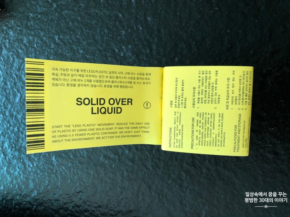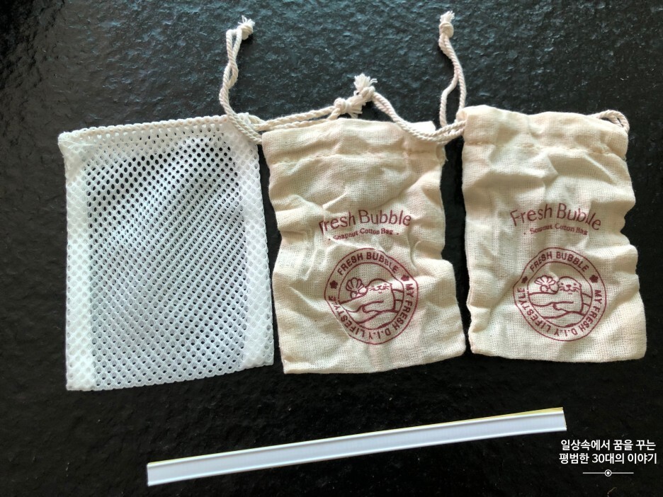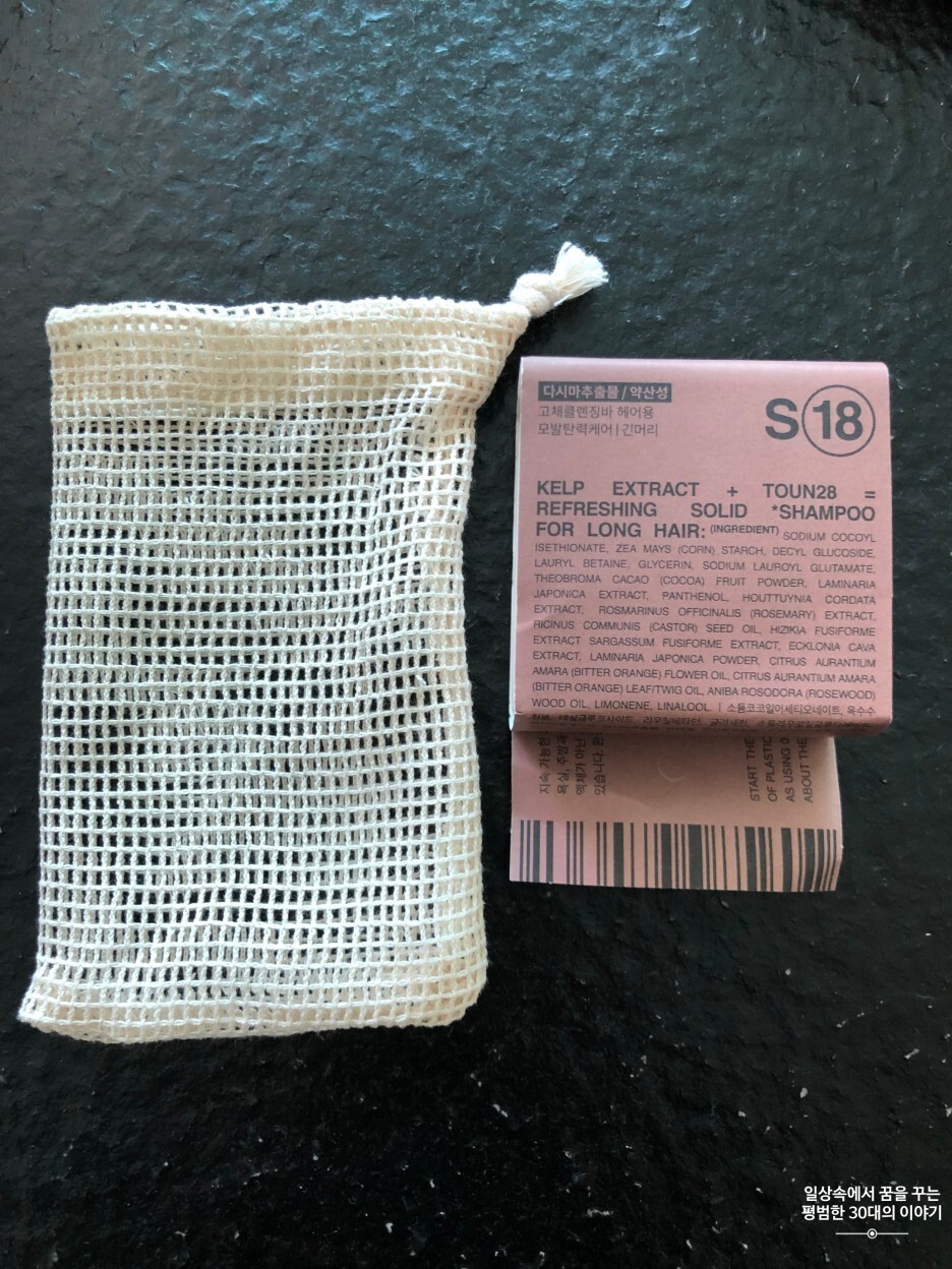 패키지 구성 중 그물망 장바구니, 수세미, 샴푸바 그리고 트리트먼트바는 이미 사용하고 있는 제품이다. 그러나 패키지에 포함되어 있는 샴푸바와 트리트먼트바의 브랜드는 아직 사용해보지 못한 브랜드의 제품이어서 사용해보고 좋으면 앞으로도 계속 사용할 생각이다. 특히 샴푸바 같은 경우는 긴 머리용으로 (여태까지 나는 긴 머리용 샴푸바가 있는 줄 몰랐다;;;) 나에게 딱 맞는 제품이었다. 사실 긴 머리의 경우, 잘 맞는 샴푸바를 찾기가 쉽지 않고 샴푸바만 사용하기에 어려움이 많다. (개인적인 의견) 주변에 제로 웨이스트를 실천하는 지인 중 나처럼 긴 머리인 경우, 조언을 얻기 위해 여러 차례 물어보기도 했지만 대부분 샴푸바와 샴푸를 혼용해서 사용하더라. 어쨌든 이번 기회에 긴 머리용 샴푸바의 존재를 알게 되었으니 사용해보고 좋으면 이 제품으로 정착할 수 있지 않을까 싶다.