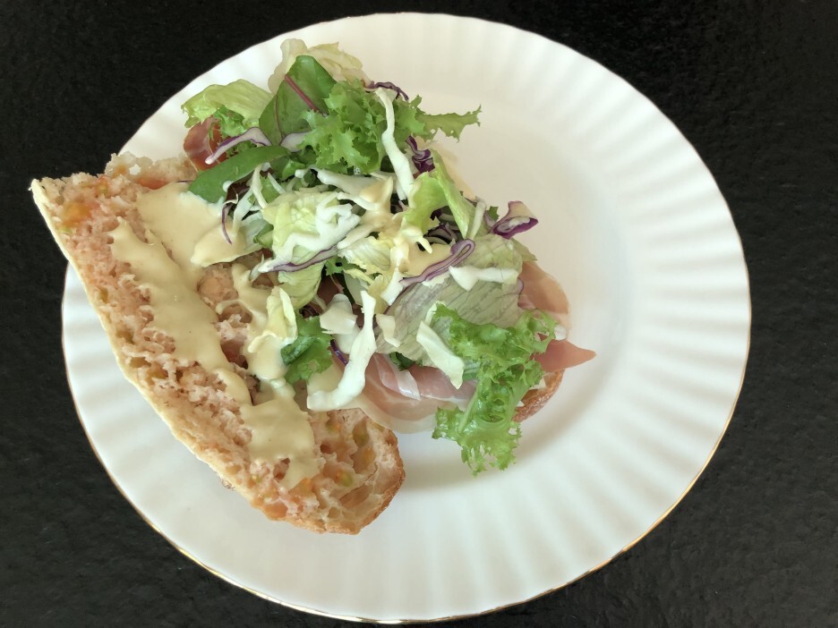바게트 샌드위치 - 바게트, 하몽, 슬라이스 치즈, 샐러드 야채, 토마토, 마요네즈, 머스터드, 꿀, 라임즙