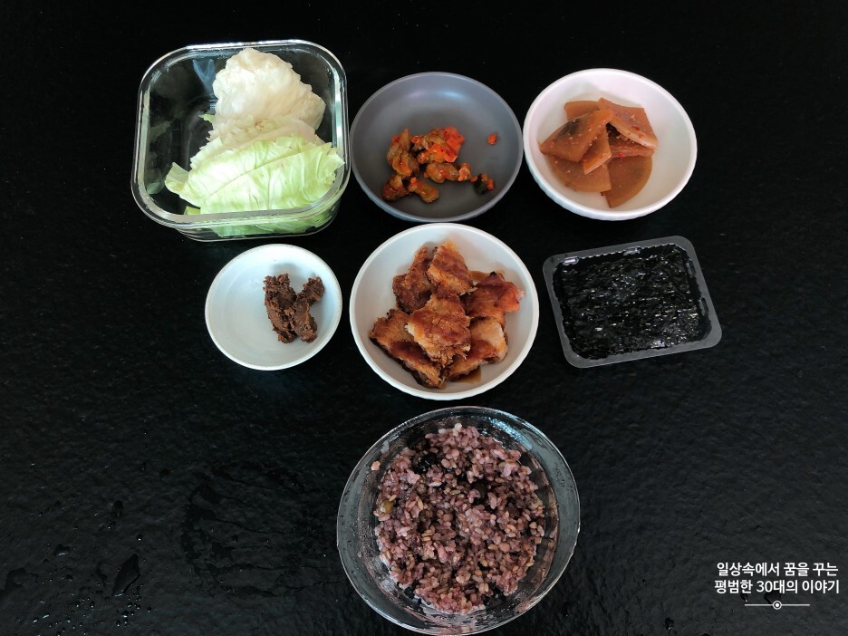 메뉴: 삶은 양배추, 무 조림, 오이지, 김, 돈가스