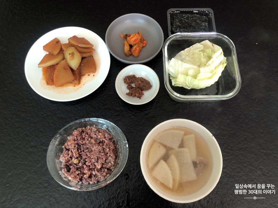 메뉴: 삶은 양배추, 무 조림, 오이지, 김, 뭇국