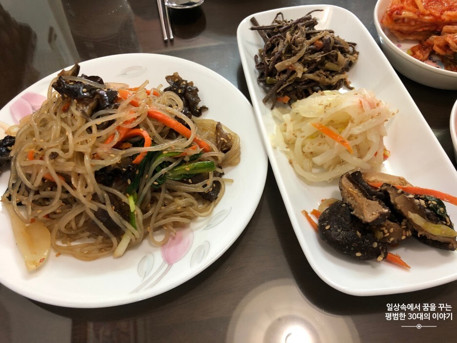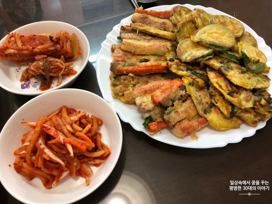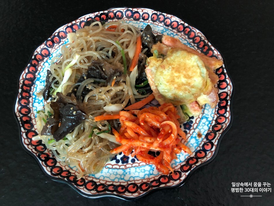 | 수요일(9/22) | 점심: 엄마표 잡채, 전, 무생채 저녁: 남편은 냉동피자, 나는 매콤한 라면 |