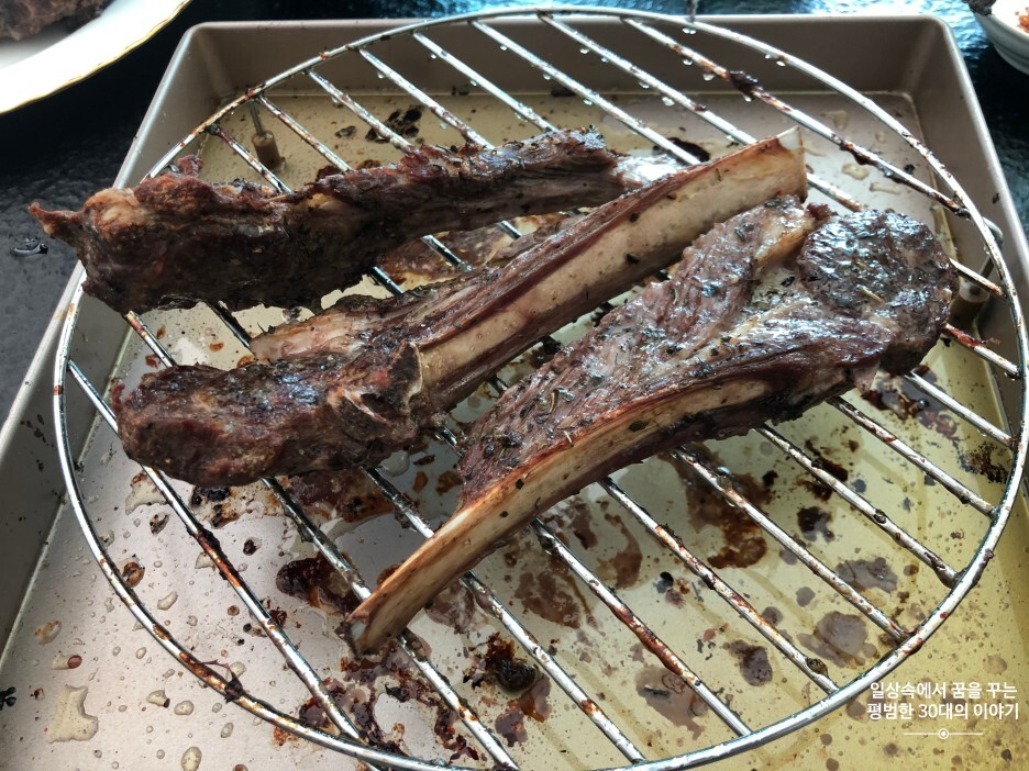 램숄더랙 오븐구이 - 램숄더랙, 타임, 오레가노, 바질, 소금, 후추, 올리브오일, 라임즙을 버무려 48시간 숙성 시키기. 220도 예열 후 210도 40분(20분 구운 후, 뒤집어 주기)