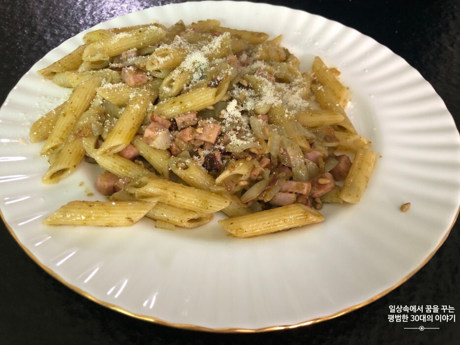바질 페스토 파스타 - 양파, 슬라이스 마늘, 추석선물로 들어온 햄, 바질 페스토, 허브소금, 파마산 치즈
