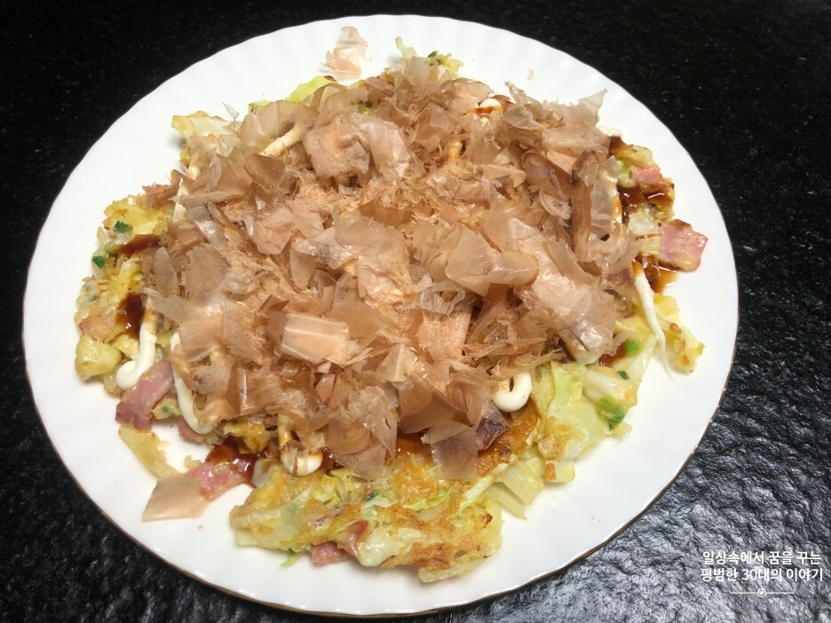 오코노미야끼 - 베이컨, 양파, 쪽파, 계란, 양배추, 마요네즈, 돈가스 소스, 가쓰오부시