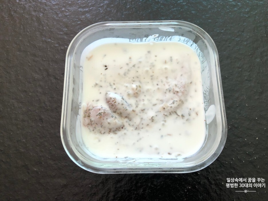 닭 안심 8개를 바질 조금, 오레가노 조금, 타임 조금, 소금 조금 그리고 후추 조금 넣고 버무린 후, 마지막에 닭 안심이 잠길 정도까지 플레인 요거트를 넣어줘요. 그리고 냉장고에 반나절 정도 넣어둬요.