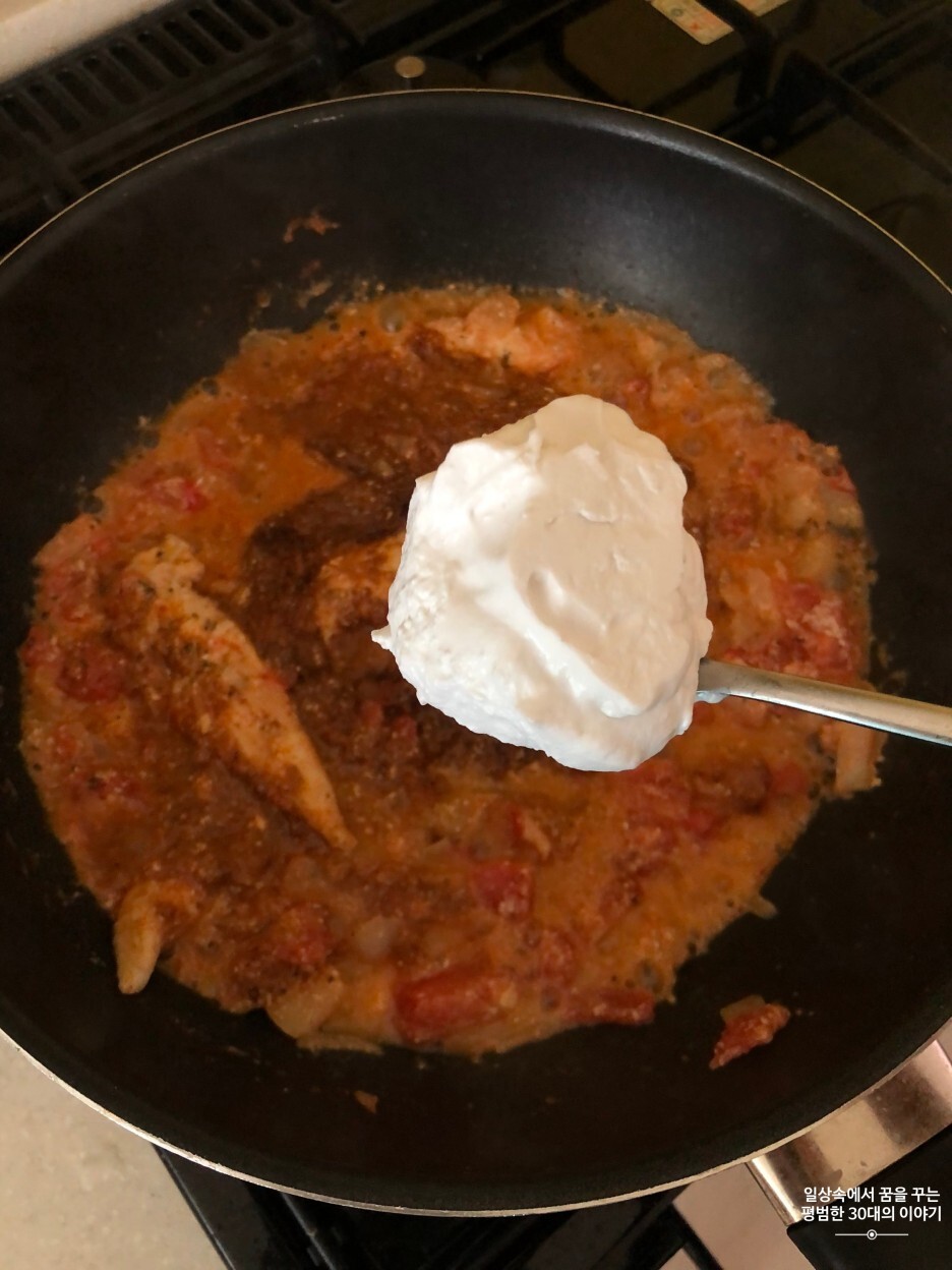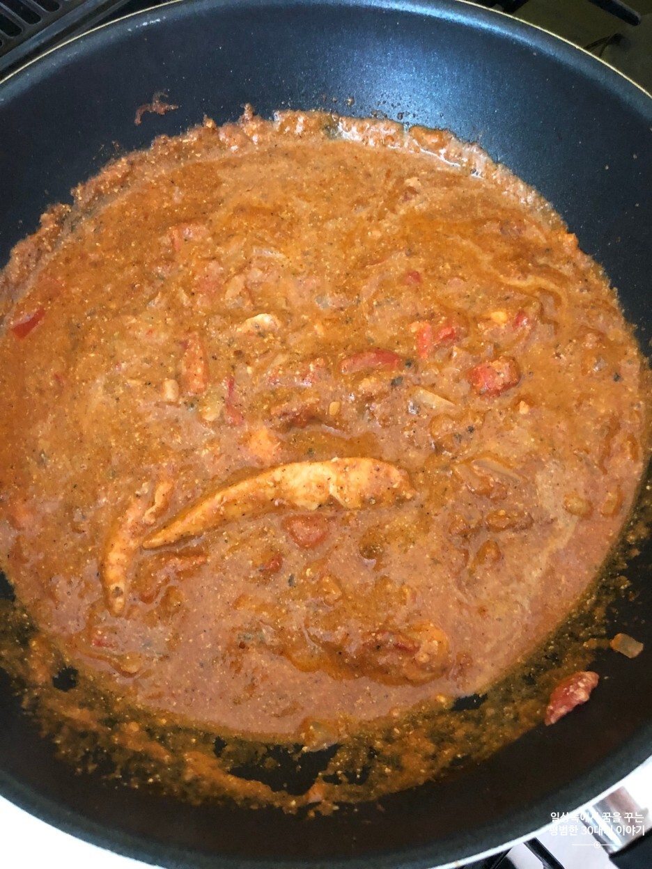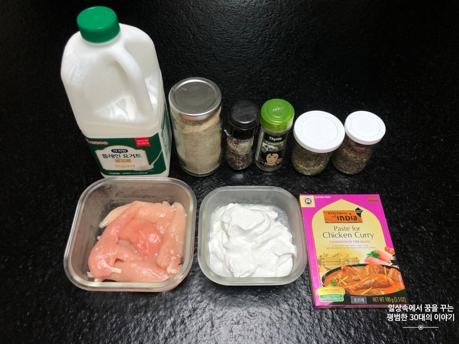 바질 조금, 오레가노 조금, 타임 조금, 소금 조금, 후추 조금, 플레인 요거트, 코코넛 밀크 2스푼, 인도 카레 페이스트, 토마토 1개(큰 사이즈 1개, 작은 사이즈 2개), 양파 반 개, 닭 안심 8개, 물 70ml