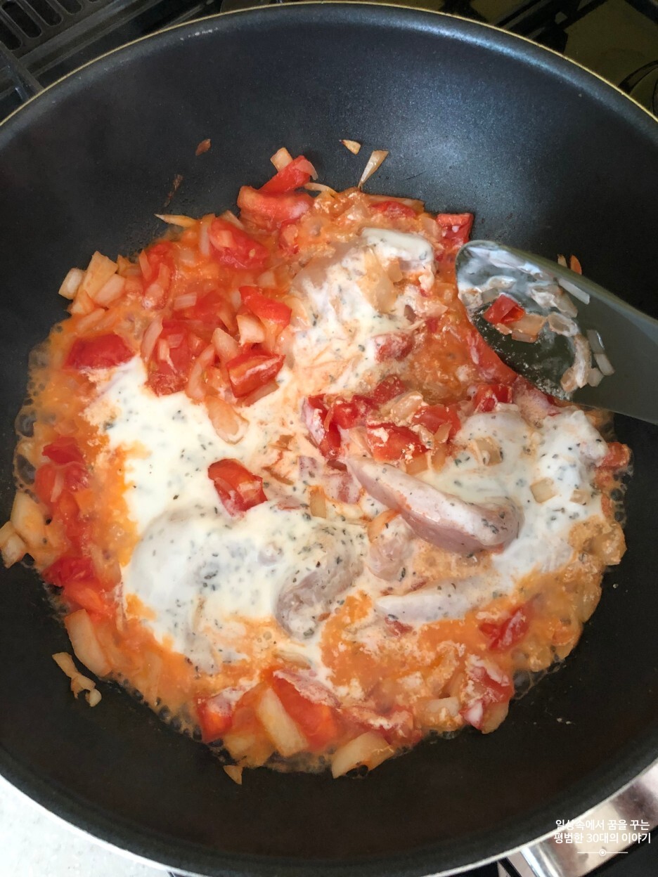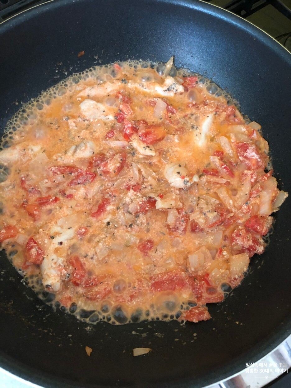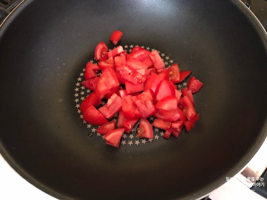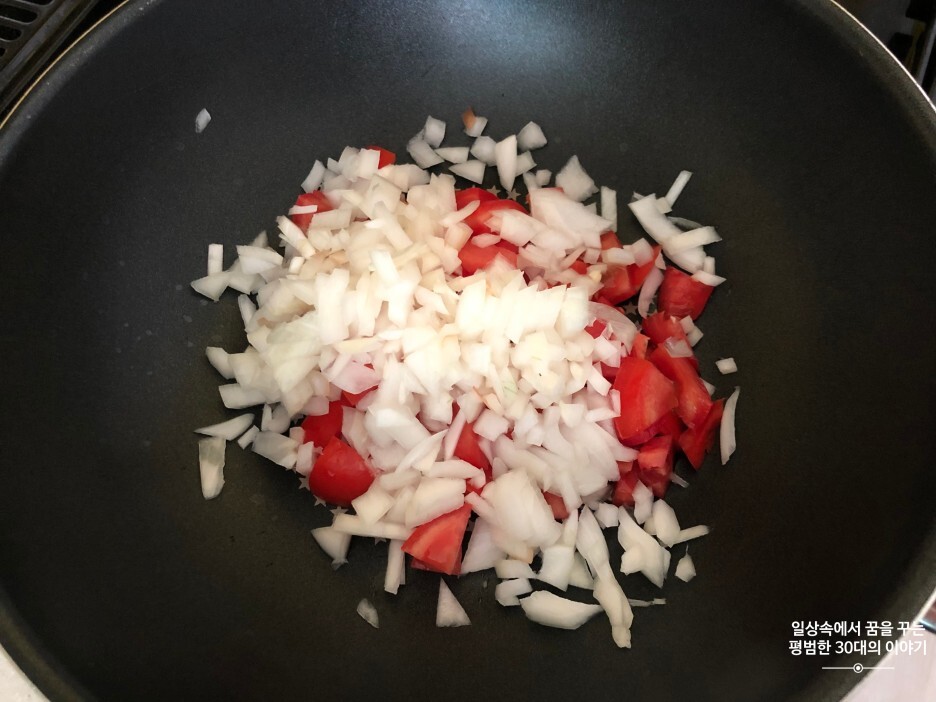 토마토와 양파를 작게 잘라 준 후, 올리브오일에 볶아줘요.