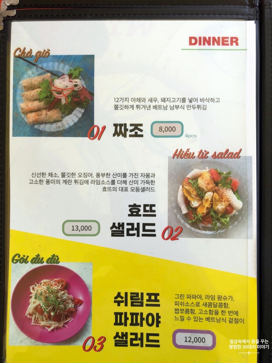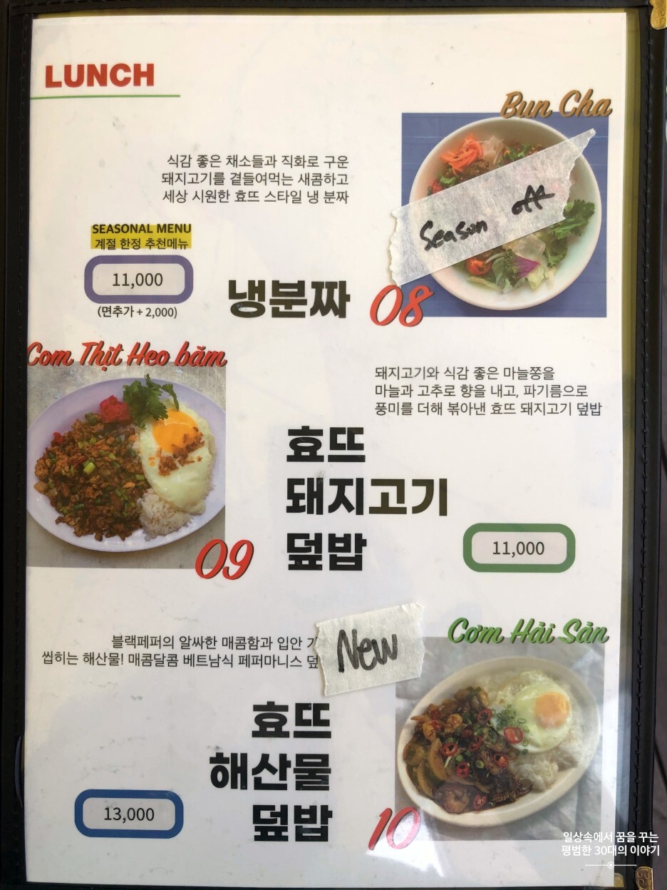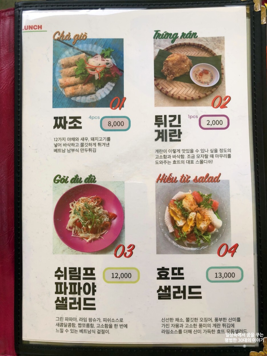 점심과 저녁에 먹을 수 있는 메뉴가 조금 다르기 때문에 점심과 저녁에 모두 방문해 보면 좋을 것 같다. 나는 이날 평일 점심에 방문했기 때문에 Lunch 메뉴에 적혀있는 메뉴만 주문할 수 있었다. 둘이서 쉬림프 파파야 샐러드(12000원), 매운 해산물 쌀국수(9000원), 효뜨 돼지고기 덮밥(11000원) 그리고 짜조(8000원)을 주문하였다.