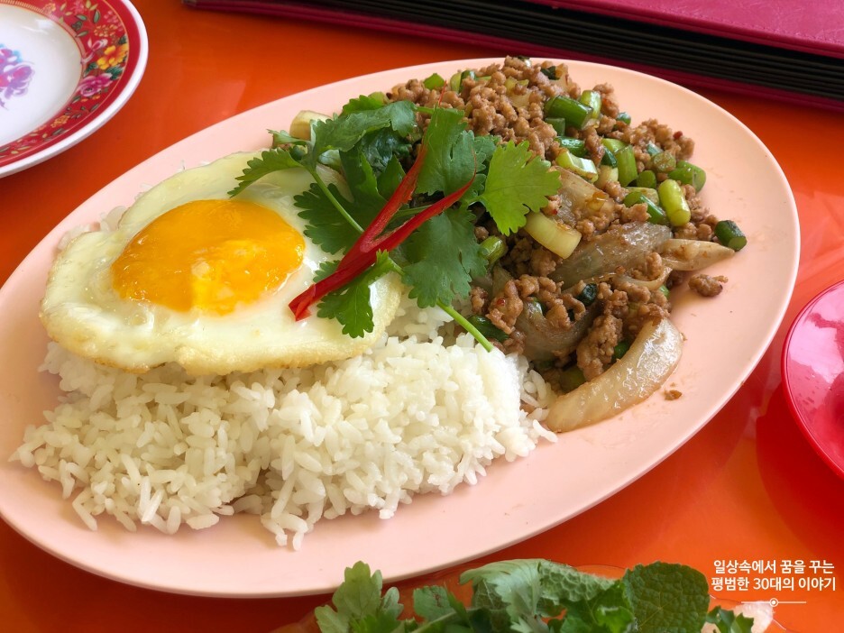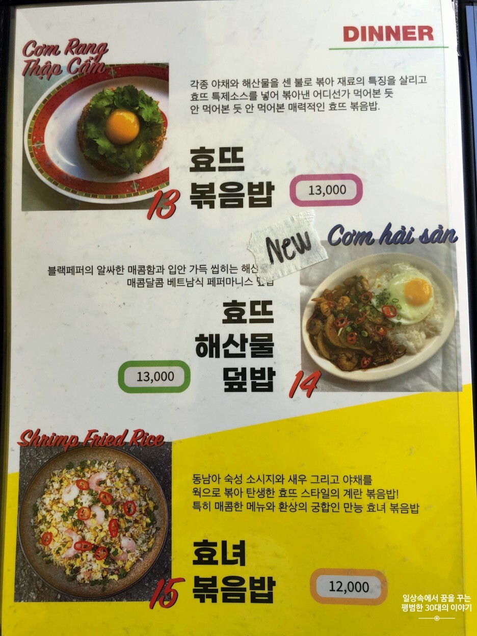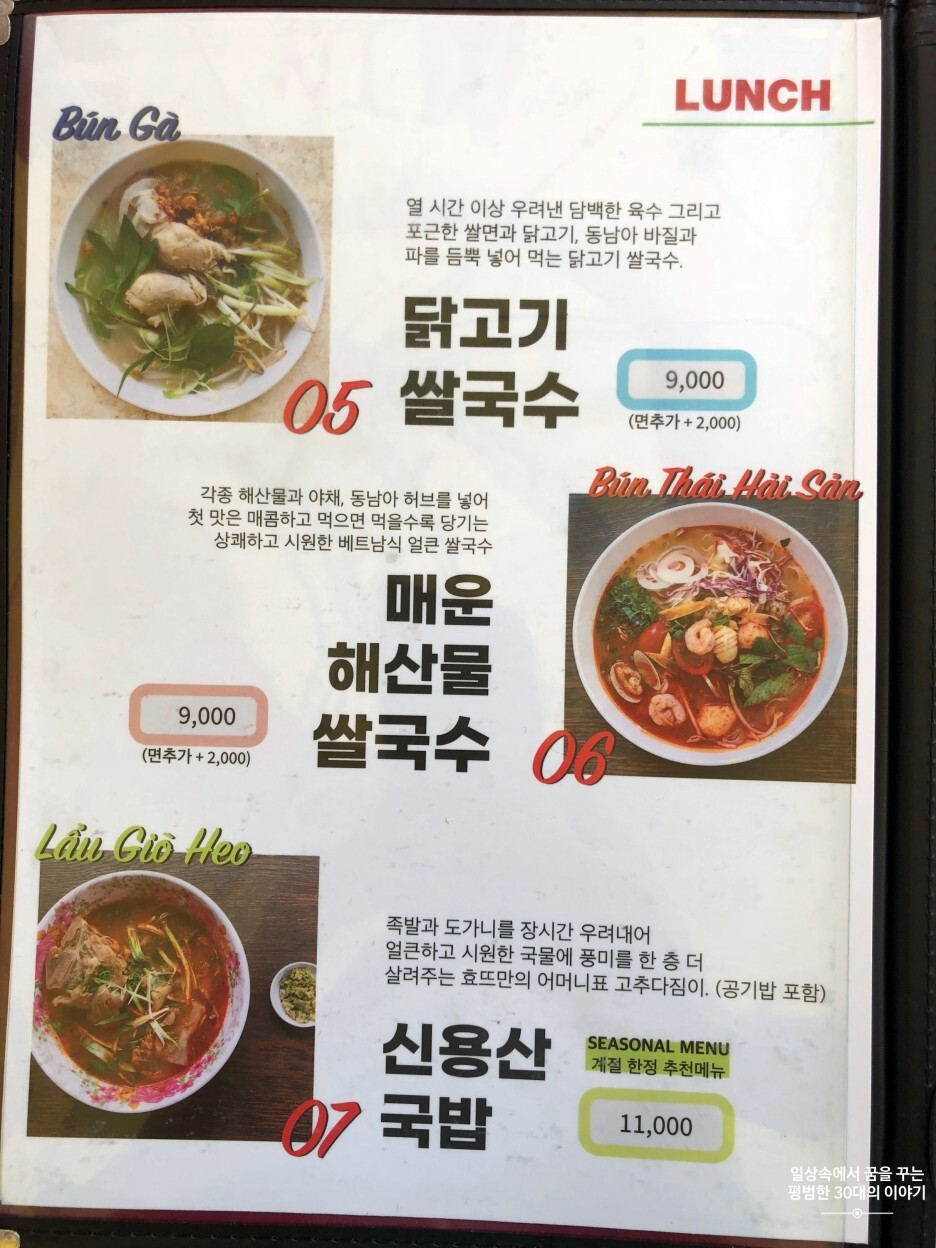 점심과 저녁에 먹을 수 있는 메뉴가 조금 다르기 때문에 점심과 저녁에 모두 방문해 보면 좋을 것 같다. 나는 이날 평일 점심에 방문했기 때문에 Lunch 메뉴에 적혀있는 메뉴만 주문할 수 있었다. 둘이서 쉬림프 파파야 샐러드(12000원), 매운 해산물 쌀국수(9000원), 효뜨 돼지고기 덮밥(11000원) 그리고 짜조(8000원)을 주문하였다.
