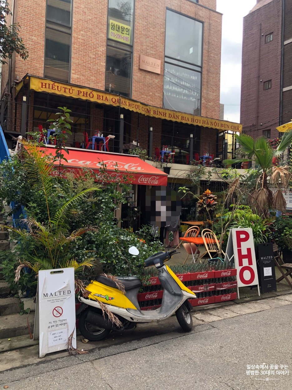 인스타그램에서 요즘 엄청 핫하다는데 블로그 이외에 SNS를 안 하는 나는 이곳에 대해 이번에 처음 알았다. 4호선 신용산역 근처에 있는데 여기에 이런 곳이 있다고(?) 싶을 정도로 한적한 주택가에 뜬금없이 자리 잡고 있는 화려한 베트남 식당 효뜨! 역시 인스타그램의 영향 때문인지 평일 오픈 시간(11시30분) 20분 전에 갔는데도 우리 앞에 두 팀이나 먼저 와 있더라. 정확히 오픈 시간에 맞춰 입장할 수 있었고 대기하면서 봐두었던 테라스 자리에 무사히 착석할 수 있었다. 생각보다 좌석이 많지 않아서 조금만 늦게 오면 꽤 오래 대기해야 할 수도 있을 듯하다.