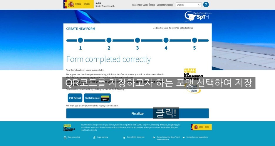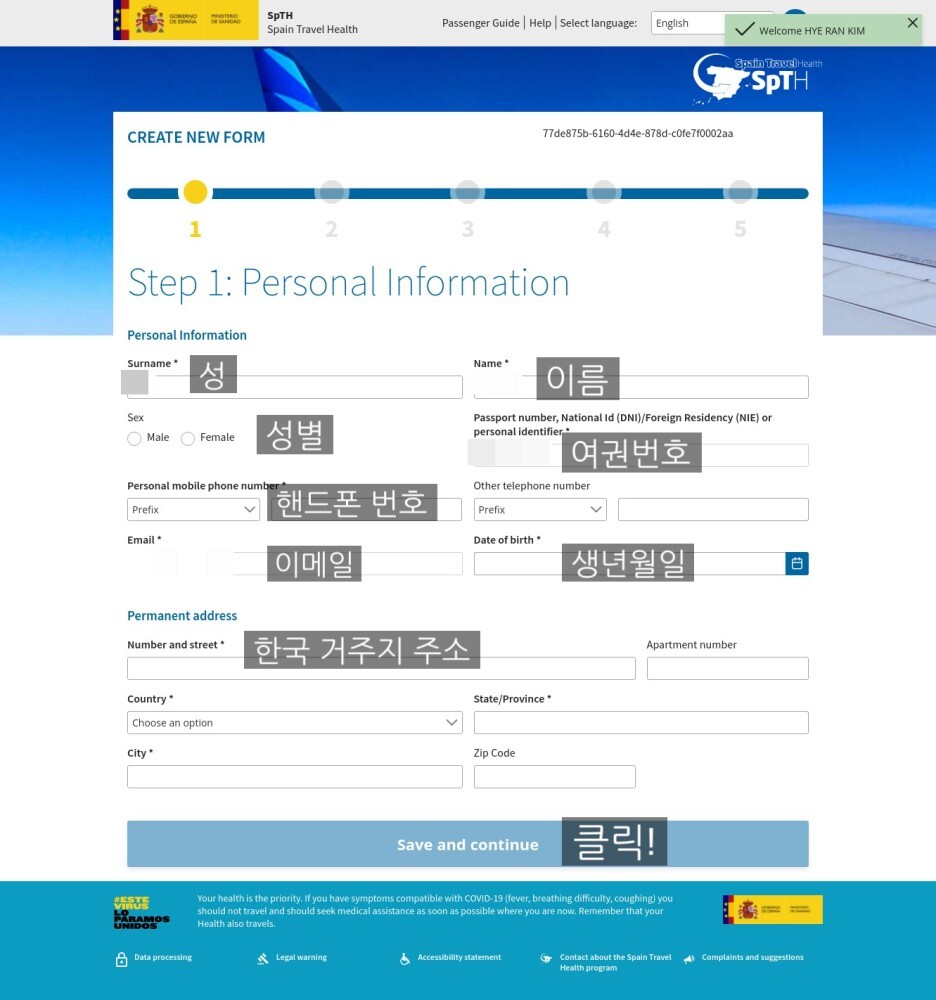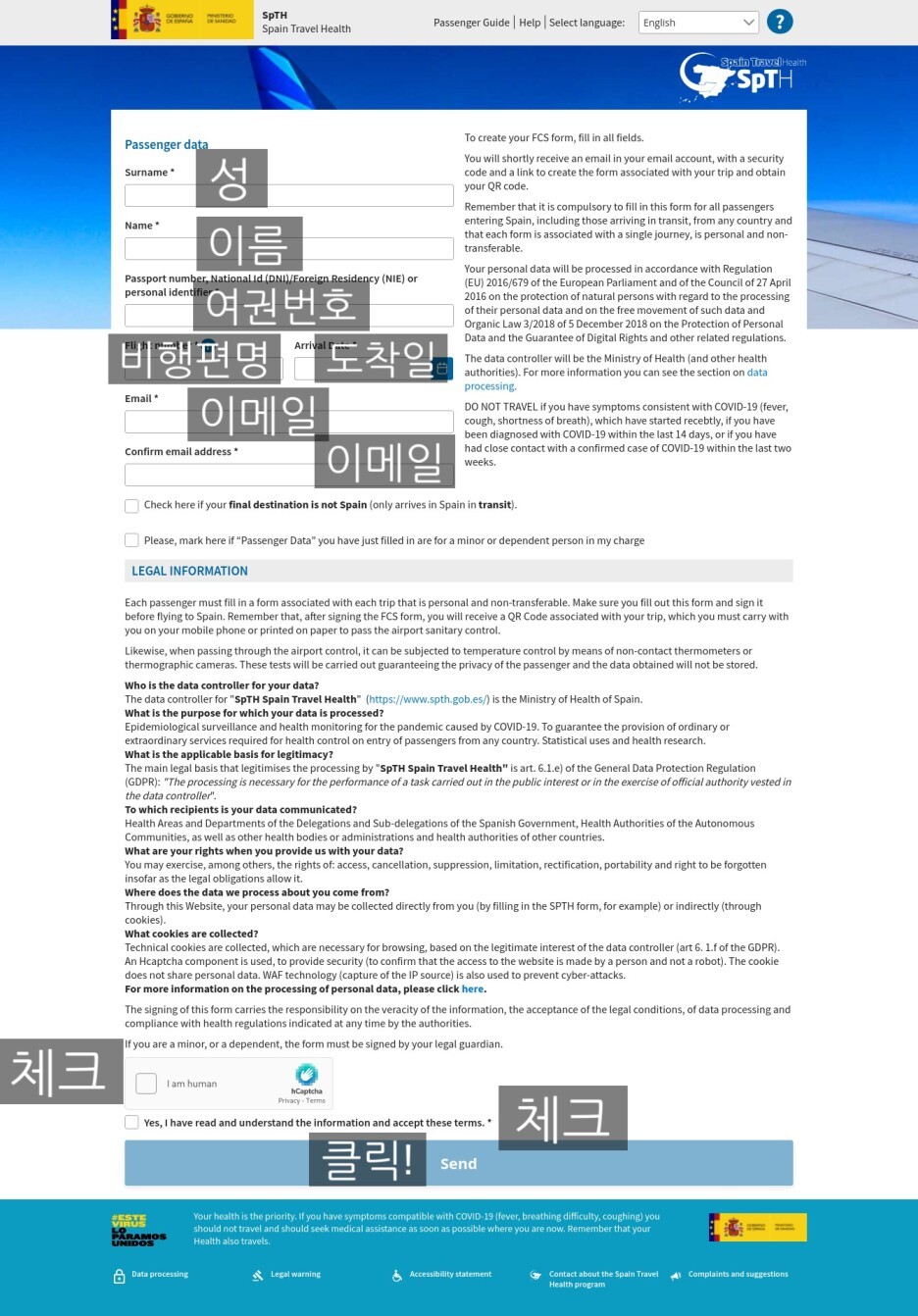 드디어 스페인으로의 입국을 앞두고 스페인 입국에 꼭 필요한 SpTH 웹사이트에서 QR코드를 받았다. 절차가 그리 복잡하지는 않다. 이 QR코드가 없으면 스페인 입국 자체가 불가능할 뿐만 아니라 인천공항에서 비행기 표 발급 자체가 안된다. 짐 부칠 때 이 QR코드와 함께 백신 접종 완료 증명서를 확인하더라.