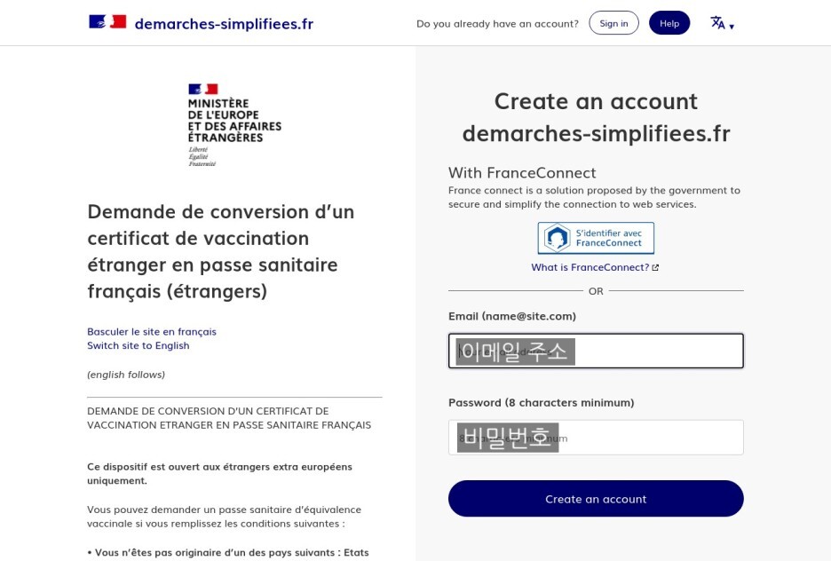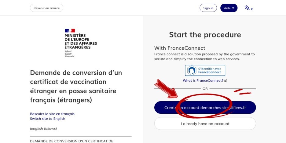 Basculer le site en français Switch site to English (english follows) DEMANDE DE CONVERSION D’UN CERTIFICAT DE VACCINATION ETRANGER EN PASSE SANITAIRE FRANÇAIS Ce dispositif est ouvert aux étrangers extra européens uniquement. Vous pouvez demander un