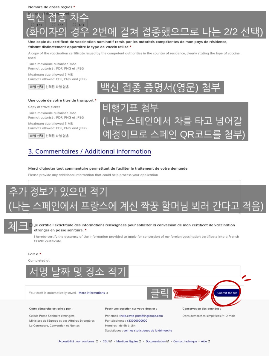 우리가 스페인에서 지내는 동안 해야 할 일 중 하나가 프랑스에 살고 계신 짝꿍의 외할머니를 뵈러 다녀오는 것이다. 그러기 위해서는 프랑스 보건 패스 QR 코드를 받아야 하는데 온라인에 보면 한국에서 프랑스로 바로 입국했을 때의 후기가 대부분이다. 나는 그와 다른 경우로 이미 한국에서 스페인으로 입국한 상태이고 차를 타고 스페인에서 프랑스로 이동할 예정인데다가 같은 EU라 해도 스페인 SpTH QR 코드로는 프랑스를 돌아다닐 수가 없다. 그래서 이리저리 알아보다가 그냥 부딪혀 보기로 하고 시도해 봤는데 하루 만에 QR 코드를 아무 문제 없이 받을 수 있었다. 역시 모르겠으면 무조건 뭐든 시도해 보는 게 좋은 것 같다. 무대뽀 정신(?) 승리!