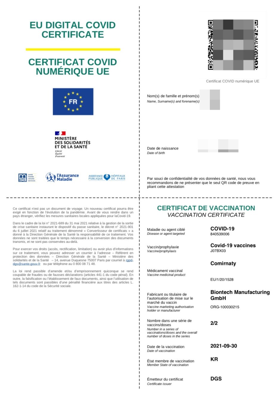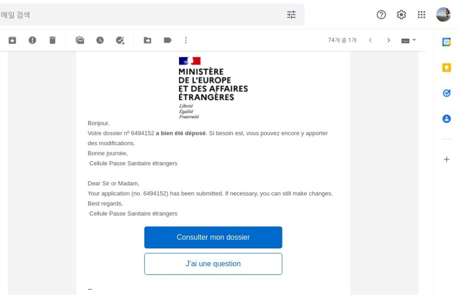 나는 24시간 만에 보건패스 QR코드를 받았다. 많은 후기에서 QR코드 메일이 너무 안 와서 마냥 기다리다가 안 온 경우도 있어서 보통 프랑스 정부가 업무 시작하는 프랑스 시간 오전 9시에 서류를 제출하면 어떤 때는 5분 어떤 때는 30분 안에 서류가 완성되었다는 이메일이 오는데 그 안에 있는 링크를 클릭하면 아래의 보건패스 QR코드 서류를 받을 수 있다.