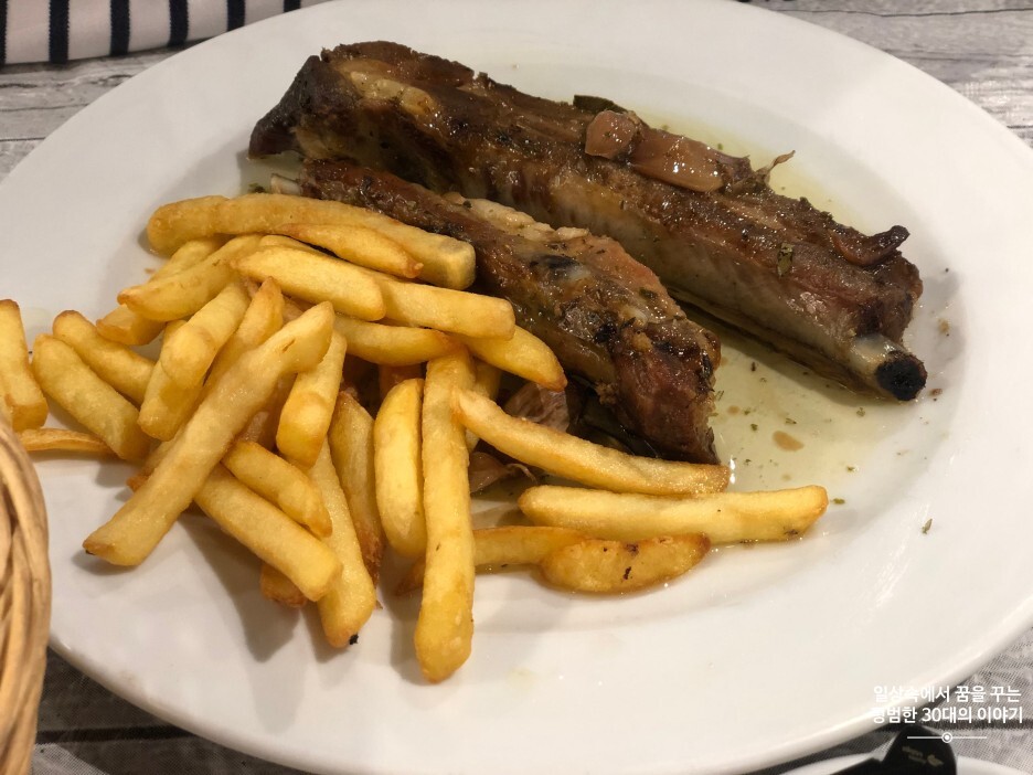내가 전채요리로 먹은 Ensalada Ilustrada는 당근, 참치, 샐러드 야채, 토마토, 캔 옥수수, 양파 그리고 아스파라거스 절임에 올리브오일과 식초가 따로 제공되어 내 취향에 맞춰 첨가하여 먹을 수 있는 샐러드였는데 양이 꽤 많았다. 이게 메인 요리라 해도 믿을 듯;;; 그리고 메인 요리로 먹은 Estofado de Carne de Ternera는 감자가 첨가된 소고기찜이었는데 오랫동안 끓인 건지 무척 부드러우면서 적당히 씹는 식감도 있어 맛있었다. 문제는 양이 너무 많다는 것인데 맛있었음에도 불구하고 대용량 샐러드의 여파로 결국 조금 남겼다. 짝꿍이 전채요리로 먹은 Estofado de Garbanzos con Callos는 나도 좋아하는 메뉴로 돼지 내장, 초리소 그리고 병아리콩이 들어간 수프라고 보면 되는데 우리나라 국밥 같다고나 할까. 한국 내장탕 같은 거 좋아하는 사람이면 이 메뉴 좋아할 듯. 메인 요리로 먹은 Costilla de Cerdo Asada는 구운 돼지갈비에 감자튀김이 곁들여져 나오는 메뉴인데 소금 간만 살짝 해서 구운 돼지갈비가 이렇게 맛있을 수가!!! 스페인 소고기는 맛있는지 잘 모르겠지만 돼지고기는 정말 맛있어서 매일 돼지고기의 재발견을 하는 중이다. 우리나라 사람들이 돼지고기 참 좋아하고 많이 먹는다고 생각했는데 스페인 사람들도 만만치 않더라.