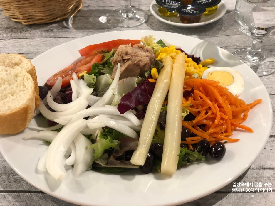 무료로 와인이 제공되지만 우리는 둘 다 술을 좋아하는 타입이 아닌지라 그냥 무료로 제공되는 물만 마셨다. 스페인에 와서 가장 놀란 것 중 하나가 와인 가격인데 정말 어느 식사 자리던 와인이 빠지지 않고 등장한다. 기본적으로 4~6인 가족이(어른 기준) 식사를 할 때 2~3가지 와인은 빠지지 않고 등장하고 1~2병은 거뜬히 마신다. 이럴 수 있는 이유는 와인 가격이 무척 저렴하기 때문이다. 그렇기 때문에 스페인 음식점 중에 무료로 와인을 제공하는 경우가 꽤 있다.(물론 대도시는 제외)