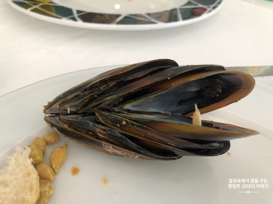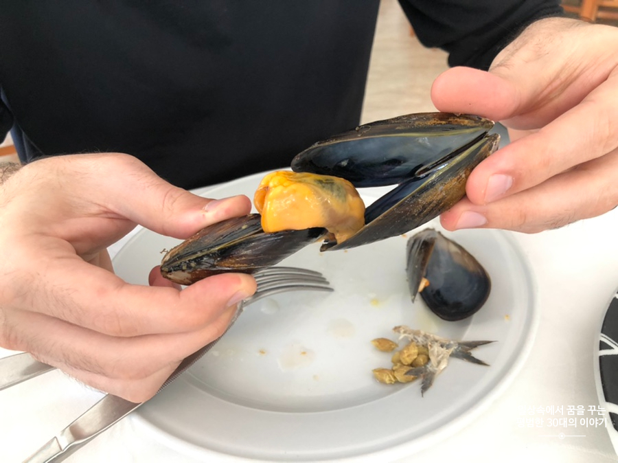 메인 메뉴는 둘 중에 하나만 선택해야 하는데 우리는 Paella marinera(minimo 2 raciones) 해산물 빠에야(최소 2인 이상 주문)를 주문했다. 우리의 목적이었던 해산물 빠에야! 그런데 앞에 전채 메뉴를 4개나 먹어서 이미 너무 배가 부른 상태였다. 스페인식 빠에야는 쌀이 설익어서 나오기 때문에 씹을 때 살짝 서걱거리는 식감이 있다. 음식점마다 쌀을 익힐 때 사용하는 육수가 다르기 때문에 여기서 음식점의 특징이 드러난다. 빠에야 위에 올라가는 토핑은 거의 대부분 비슷한 것 같다.(홍합, 오징어, 새우 등) 한 입 먹어보니 육수의 맛이 쌀에 진하게 베여있어 꽤 맛있다. 빠에야의 장인인 짝꿍의 고모부가 왜 여기를 추천했는지 알 수 있었다. 하지만 너무 배불러서 결국 먹다 남은 음식은 집에 싸와서 다음날 점심으로 먹었다.