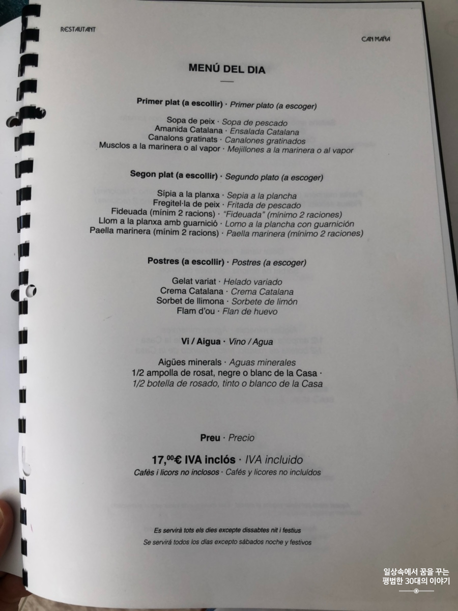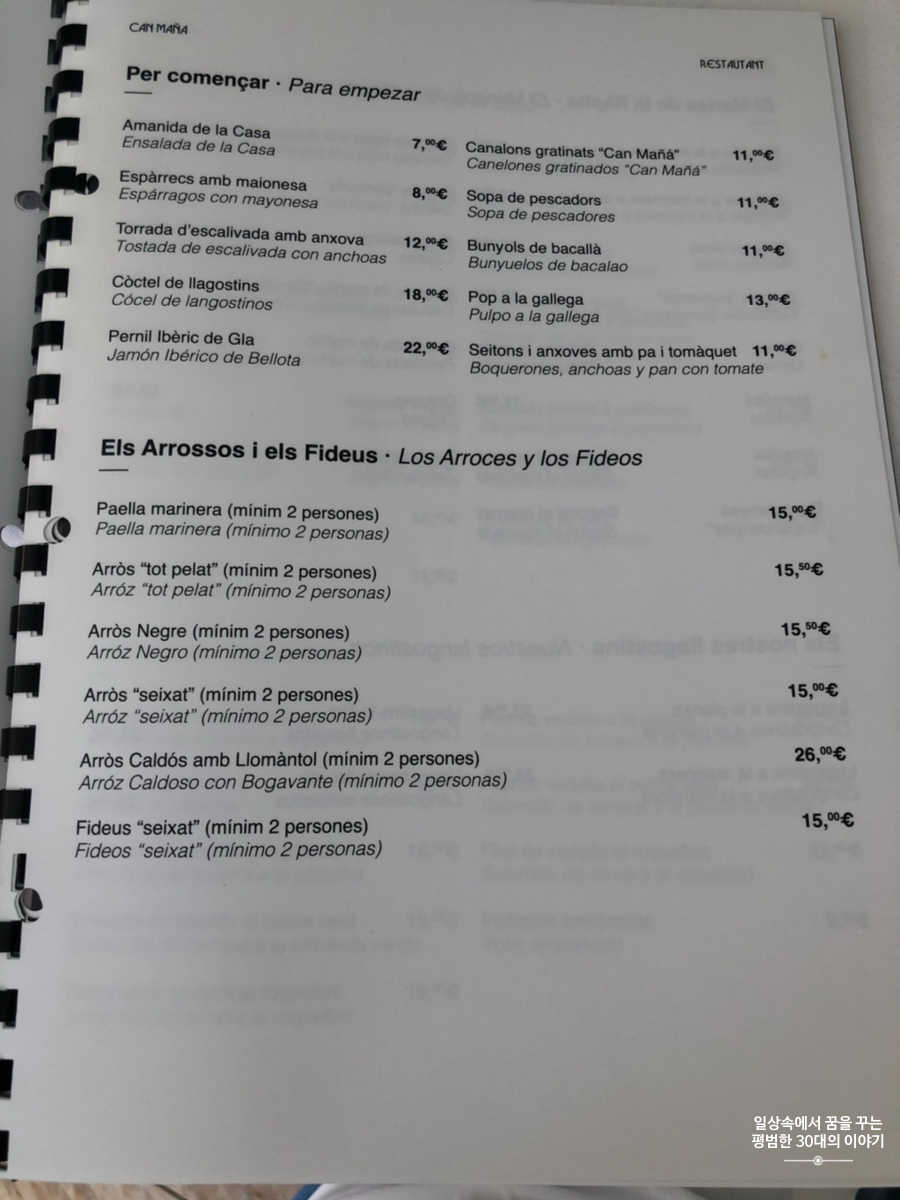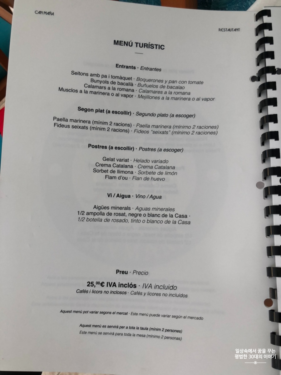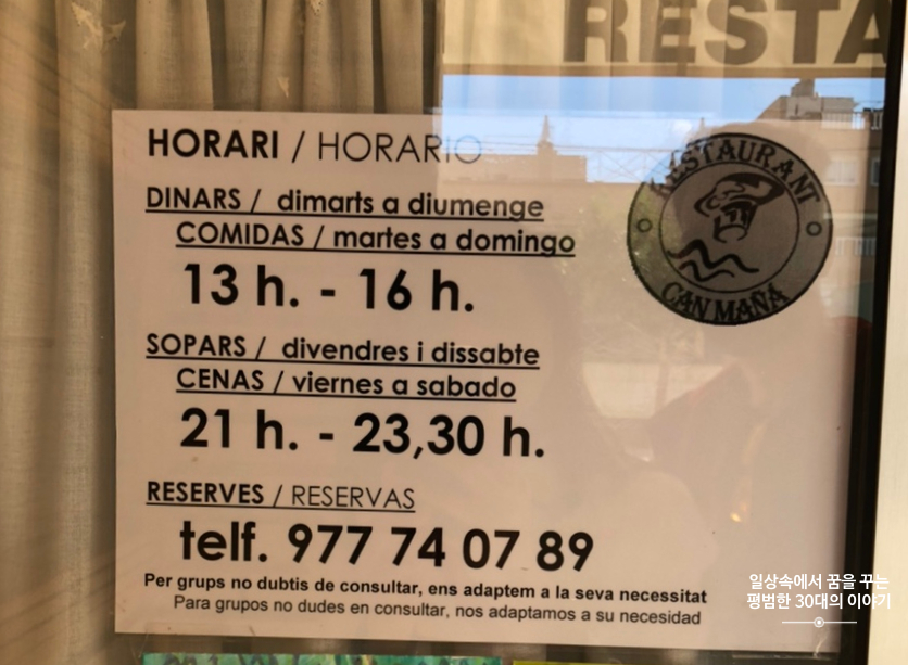 스페인은 보통 2시에 점심을 먹기 시작하고 9시에 저녁을 먹기 시작하기 때문에 그 시간에 맞춰 음식점이 여는 곳이 많다. 그리고 물론 중간에는 브레이크 타임이 있다. 워낙 워라밸을 중시하는 나라이기 때문에 대도시가 아닌 이런 작은 도시에 있는 대부분의 음식점, 상점 등은 브레이크 타임이 있어 오후만 되면 도시가 텅 빈 것처럼 조용하다. Restaurant Can Maña의 영업시간은 다른 음식점보다 더 짧다. 대체 이렇게 해서 어떻게 먹고 사는지 궁금함이 밀려오지만 이것이 문화 차이겠지.