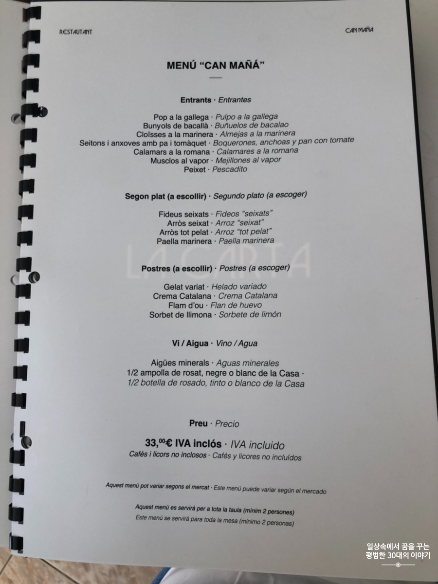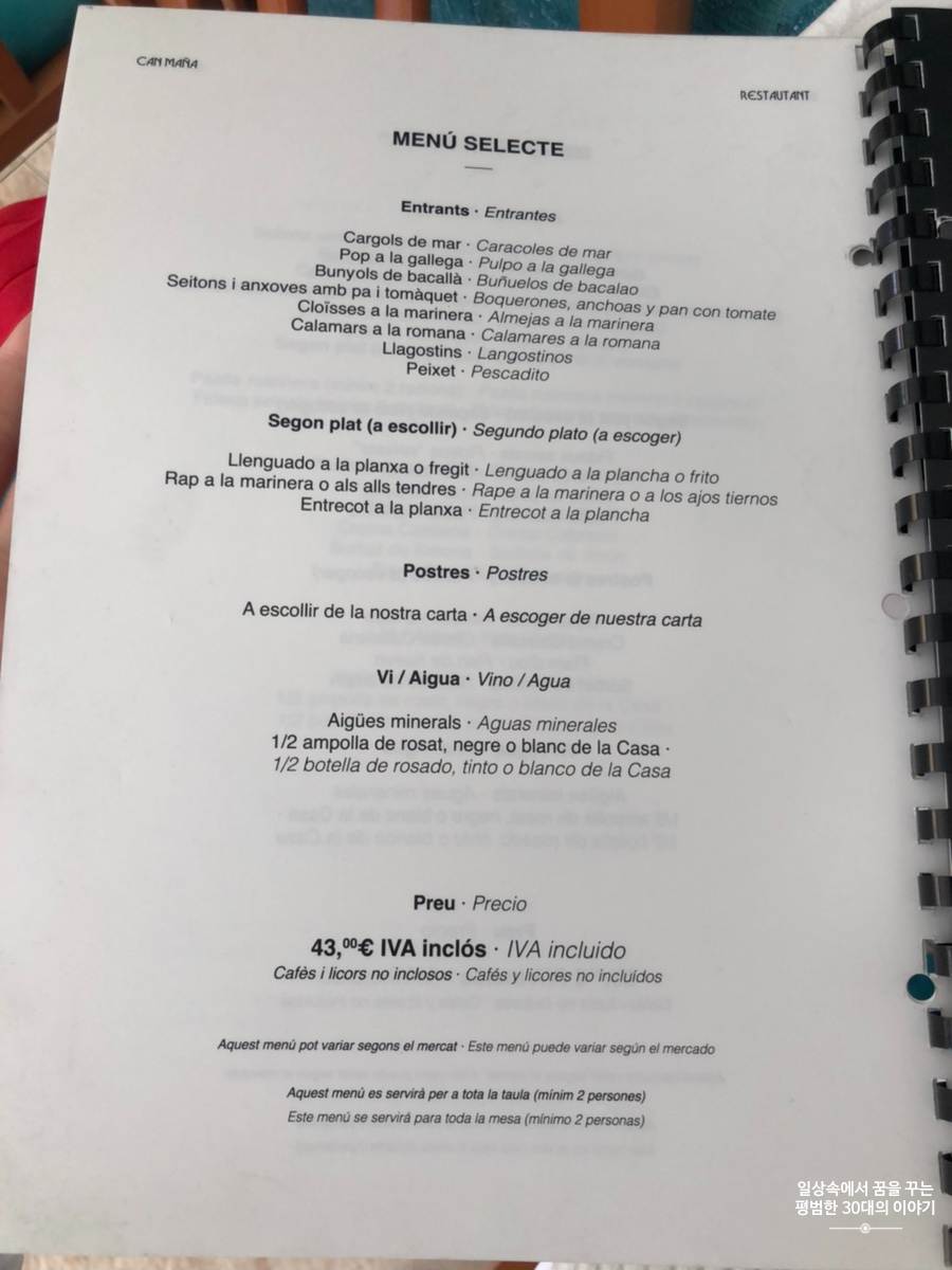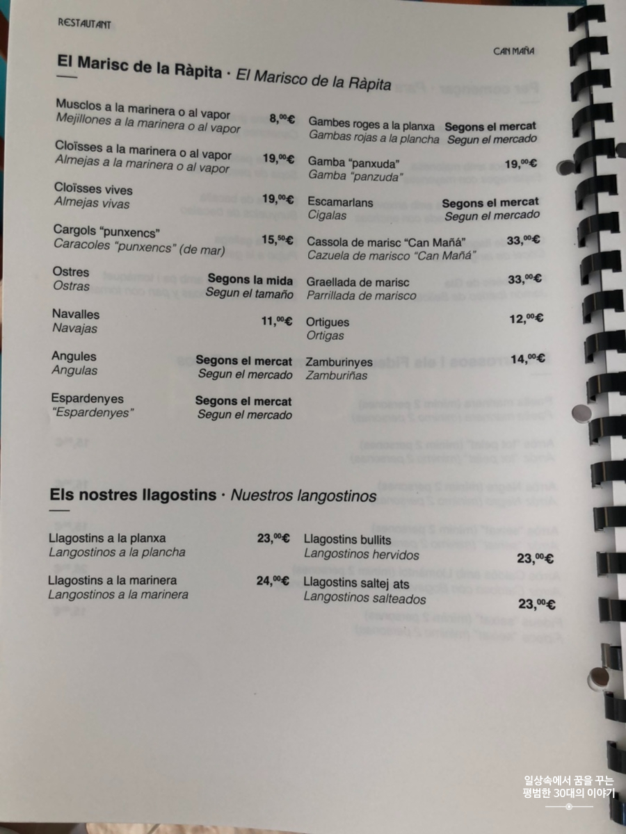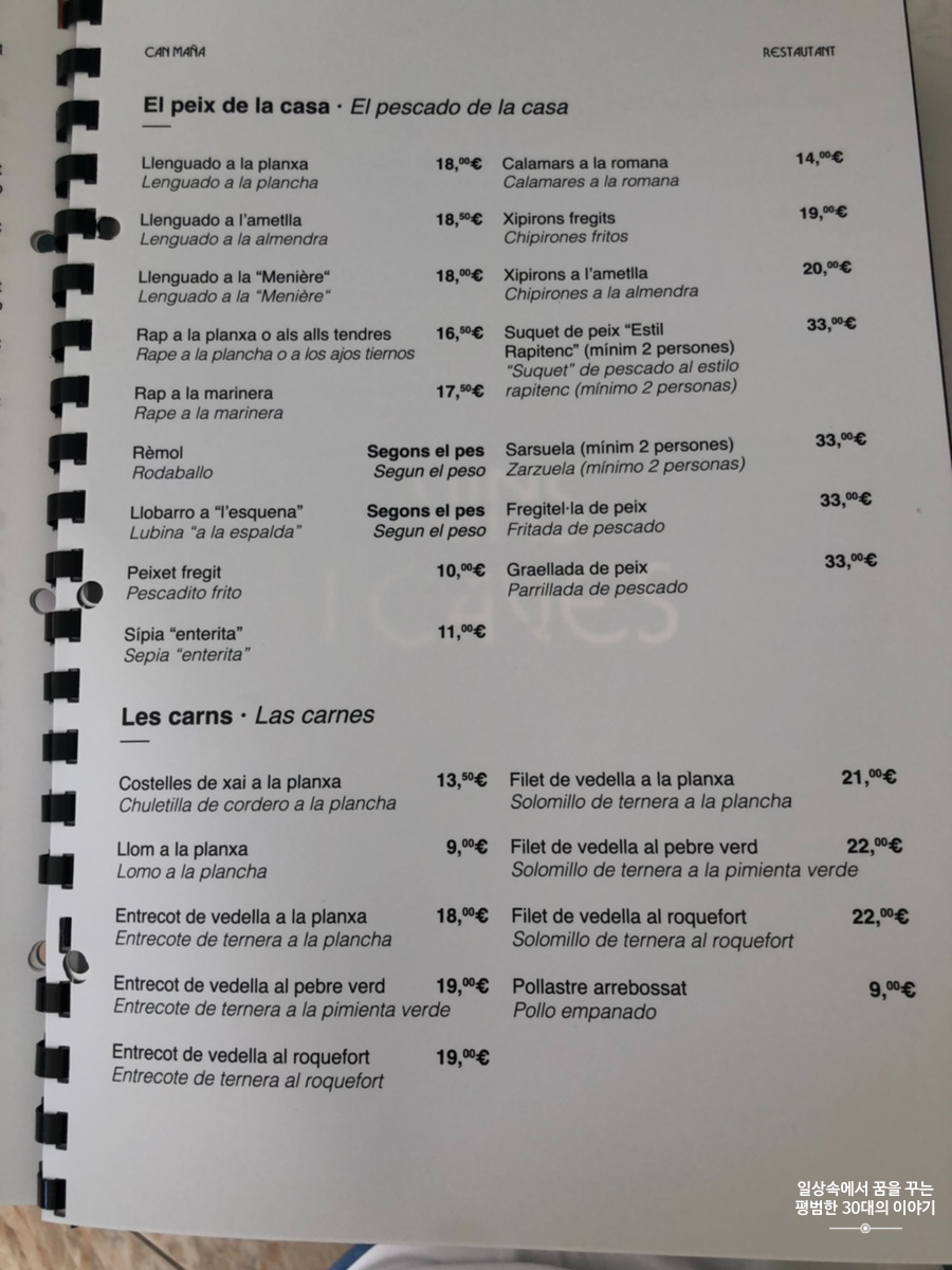 스페인은 보통 2시에 점심을 먹기 시작하고 9시에 저녁을 먹기 시작하기 때문에 그 시간에 맞춰 음식점이 여는 곳이 많다. 그리고 물론 중간에는 브레이크 타임이 있다. 워낙 워라밸을 중시하는 나라이기 때문에 대도시가 아닌 이런 작은 도시에 있는 대부분의 음식점, 상점 등은 브레이크 타임이 있어 오후만 되면 도시가 텅 빈 것처럼 조용하다. Restaurant Can Maña의 영업시간은 다른 음식점보다 더 짧다. 대체 이렇게 해서 어떻게 먹고 사는지 궁금함이 밀려오지만 이것이 문화 차이겠지.