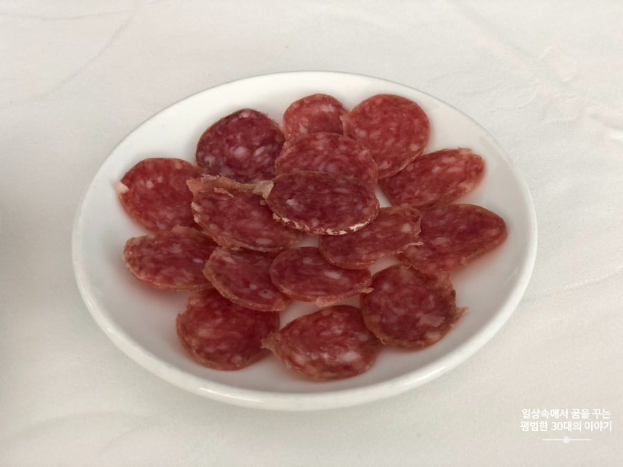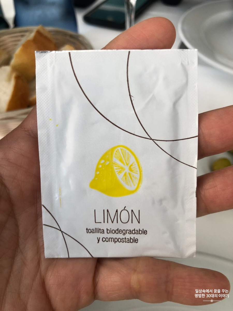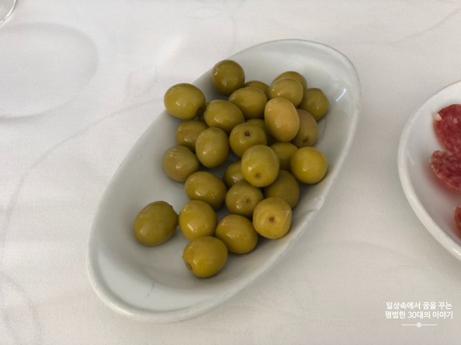 좌석에 앉자마자 Fuet, 올리브, 바게트 빵이 테이블 위에 놓이고 레몬향이 나는 물수건을 준비해 주었다. 보통 코스 요리를 주문하면 음료가 포함이기(와인, 물, 탄산수 중 선택) 때문에 우리는 물과 탄산수를 주문했다. 점심 코스 메뉴 치고 다른 음식점에 비해 꽤 비싼 편이었지만 제공되는 음식의 양과 맛을 생각하면 충분히 이해가 된다.