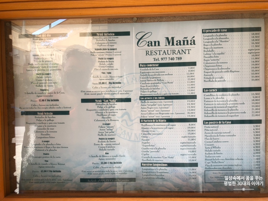 내가 지금 지내고 있는 스페인의 작은 바닷가 마을인 Sant Carles de la Ràpita는 유럽인들의 여름 휴양지이다. 지금은 비수기라 마을이 텅 비어있다시피 하지만 여름이 되면 유럽 각지에서 몰려든 관광객으로 북적거린다. 그래서인지 마을 크기에 비해서 음식점이 꽤나 많은데 우리가 방문한 Restaurant Can Maña는 Paella의 장인인 짝꿍 고모부의(짝꿍의 고모부는 Paella 장인으로 집에 Paella 전용 화덕(?)이 따로 있을 정도로 Paella에 열정적이시다. 벽에는 다양한 사이즈의 Paella 팬이 걸려있다.) 추천을 받아 가게 된 음식점이다. 내가 Paella가 먹고 싶다고 했더니 짝꿍의 고모부가 추천해 주셨다. 나도 짝꿍도 Paella를 참 좋아서 종종 한국에서 만들어 먹기도 했는데 아무래도 스페인식 Paella와는 맛이 다를 수밖에 없다. 그래서 스페인에 사는 동안이라도 스페인식 Paella를 종종 사 먹기로 했다.