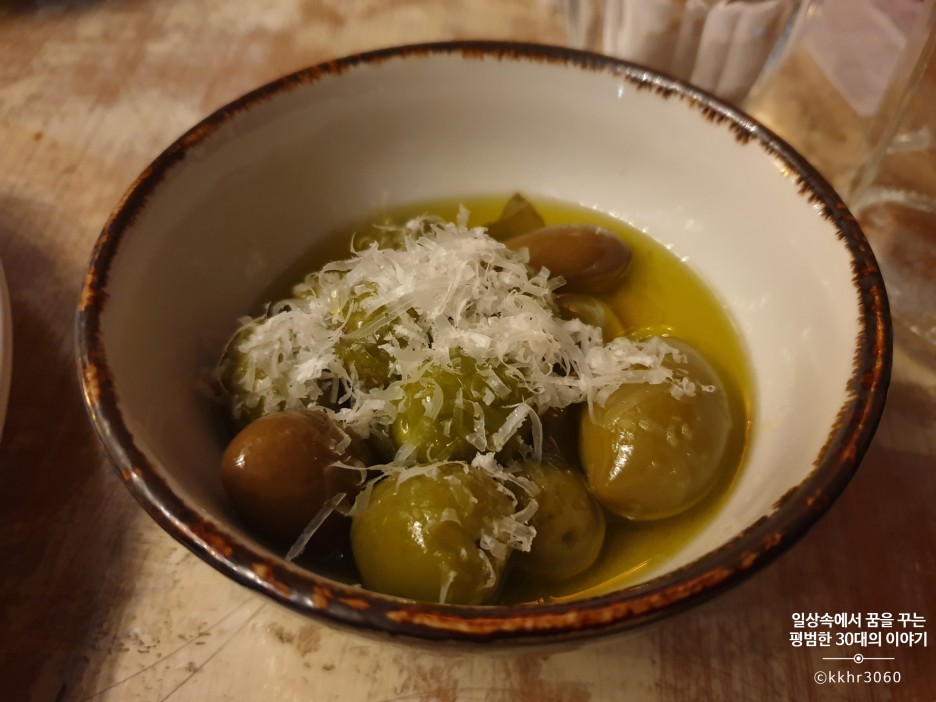 그래서 자연스레 사이드 메뉴로 올리브를 주문한 나는 올리브 초보인 주제에 올리브 맛이 어떤지 평가하고 있는 나를 발견하며 방정맞은 입을 손으로 지그시 눌러주었다.