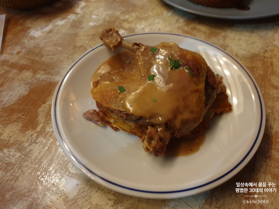 맛있어 보이는 메뉴가 너무 많아서 고민 또 고민을 하다 고른 메인 메뉴! 'Confit de canard' (장시간 부드럽게 조리한 오리 다리 콩피와 뽐므파이아송, 그린페퍼소스)와 'Porc aux pruneaux' (건자두를 넣어 구운 돼지 삼겹살과 주키니 호박 그라탕)이 파테를 먹어치우자마자 나왔다. 양이 이게 뭔가 싶지만 절대 네버 적지 않다. 대식가인 나는 파테를 보고 코웃음을 쳤지만 먹어보니 굉장히 금새 배를 부르게 만드는 마법 같은 음식이었다.