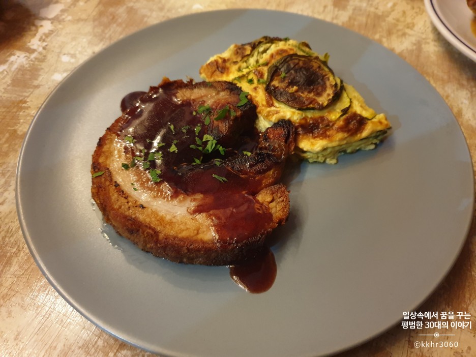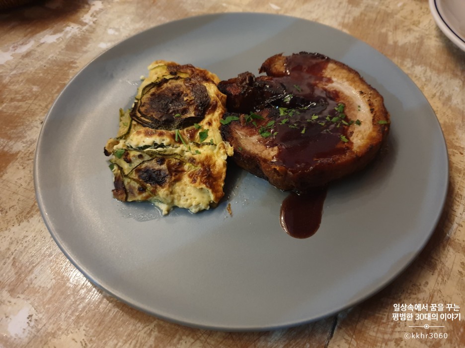 사실 나는 오리고기보다는 돼지고기를 선호하기 때문에 'Porc aux pruneaux'을 먼저 먹었다. 겉은 바삭하고 속은 촉촉했다. 비계의 부드러움과 쫄깃한 맛을 둘 다 잘 살려낸 삼겹살이었다. 나에게는 그저 잘 구운 삼겹살 덩어리로 보일뿐...! 나는 구운 돼지고기보다 옆에 곁들여져 나온 주키니 호박 그라탕이 더 맛있었다. 처음에는 그냥 호박이 들어간 오믈렛인가 싶었는데 입속에 넣는 순간 너무 부드러워서 금새 사라졌다. 부드러운 계란 속에 식감이 살아있는 야채들이 많이 들어있었다.
