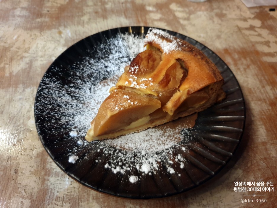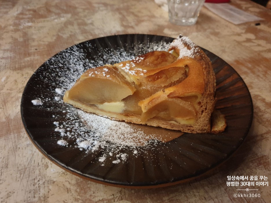 메인 요리 두 가지를 먹고 나니 나는 도저히 배가 불러 아무것도 먹을 수 없을 것 같았는데 짝꿍이 여기서 꼭 먹어야 하는 디저트가 있다고 해서 그럼 한 개만 주문하자고 타협해서 주문했다. 우리나라 카페에서는 찾아보기 어려운 사과 타르트! 내 입맛에는 퍽퍽한 도우에 절인사과를 넣은 파이 같아서 별로 먹지도 못하겠더구먼 짝꿍은 뭐가 그렇게 맛있는지 그걸 또 뚝딱 다 해치웠다. 짝꿍이 본인 어머니가 만든 사과파이가 더 맛있긴 하지만 일반 베이커리나 카페에 가도 찾아보기 어려운 메뉴이니 먹어볼 수 있었다는 것만으로도 만족한다며 밑바닥까지 싹싹 다 긁어먹었다.