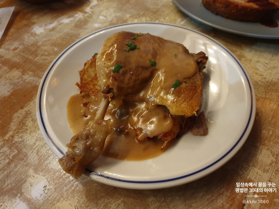 그러고 나서 먹어본 'Confit de canard'. 너무나 부드러운 오리고기가 함께 나온 소스가 너무 잘 어울렸다. 그리고 이것도 'Porc aux pruneaux'와 마찬가지로 곁들여져 나온 감자전(?)이 너무 맛있었다. 오리고기 밑에 감자전(?) 같은 게 있었는데 맛은 감자전과 굉장히 흡사했는데 식감이 좀 더 바삭했다.