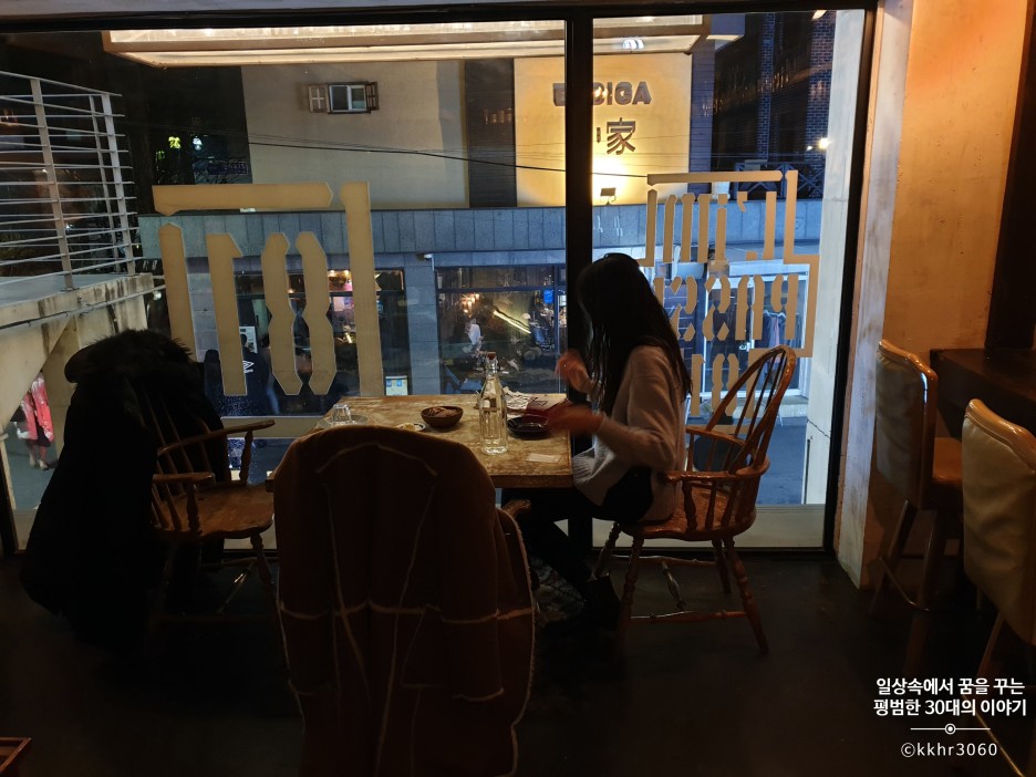 열심히 블로그를 위해 메뉴 사진을 찍고 있던 나를 내 블로그의 1등 공신인 짝꿍이 연신 찍어줬다. 저렇게 찍다가 간혹 짝꿍이 나의 엽사를 건지기도 하는데 그럼 세상에서 제일 행복한 표정으로 그 엽사를 보며 예쁘지 않냐고 나에게 묻는다. 혹시 다른 사람한테 그 사진을 자랑삼아 보여주기라도 할까 봐 두렵기만 한 나는 짝꿍이 방심한 틈을 타 지워버리곤 한다. 하지만 철저한 짝꿍은 백업을 수도 없이 많은 곳에 해놔서 지워도 지워도 어딘가에 나의 흑 역사가 계속 남아있다. 그래서 이젠 찍거나 말거나 내버려 둔다.