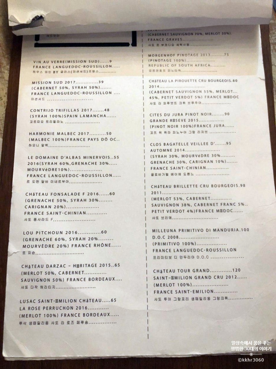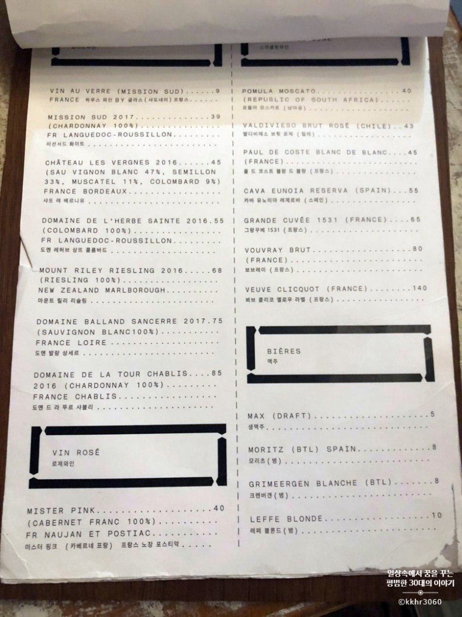 저렴한 식당은 아니다. 하지만 웬만한 다른 프랑스 음식점들보다는 저렴하면서 맛도 좋다. 미슐랭이나 블루리본서베이에 나왔다는 식당들이 다 맛있는 것은 아니지만 그래도 몇 년 동안 꾸준히 두 곳 모두에서 인정받았다는 건 그만큼 맛이 보장된다는 의미가 아닐까?
