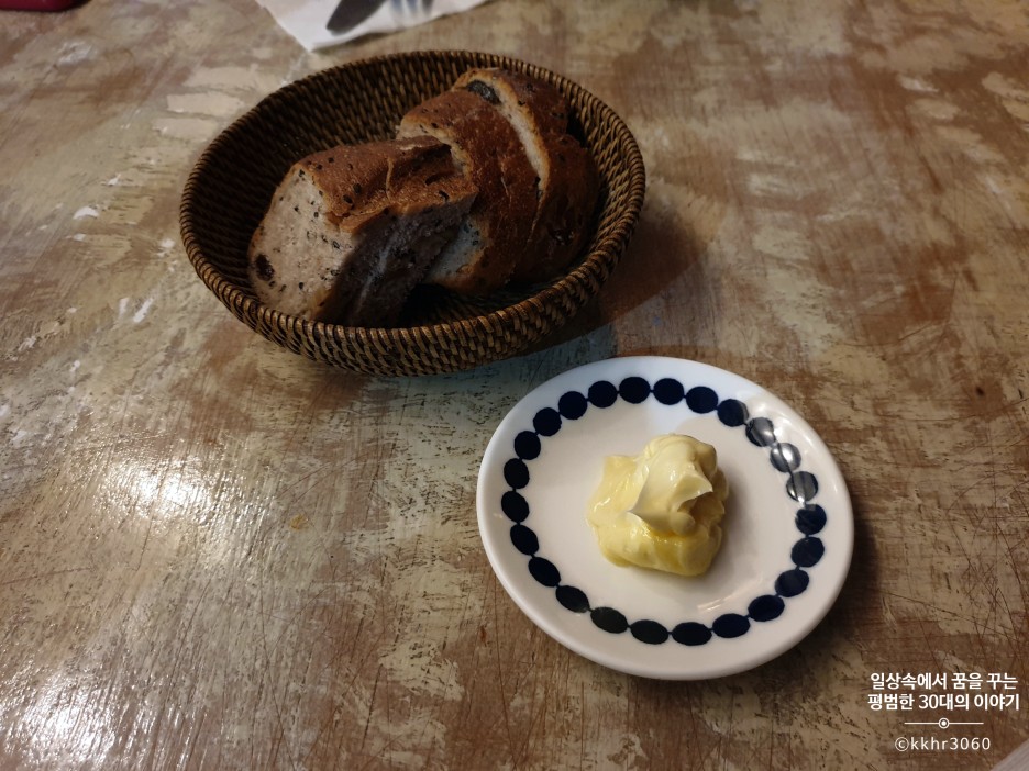 식전에 나온 빵과 무염버터. 보통은 살짝 짭짤한 버터가 나오곤 하는데 여기는 무염버터를 제공해주더라.