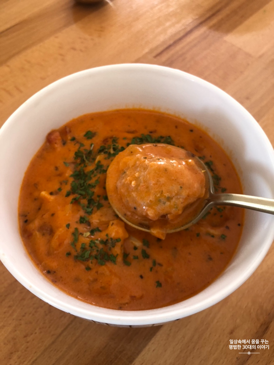 미트볼 로제 수프 - 홀 토마토, 미트볼, 양파, 양송이버섯, 생크림, 바질가루, 올리브오일, 후추